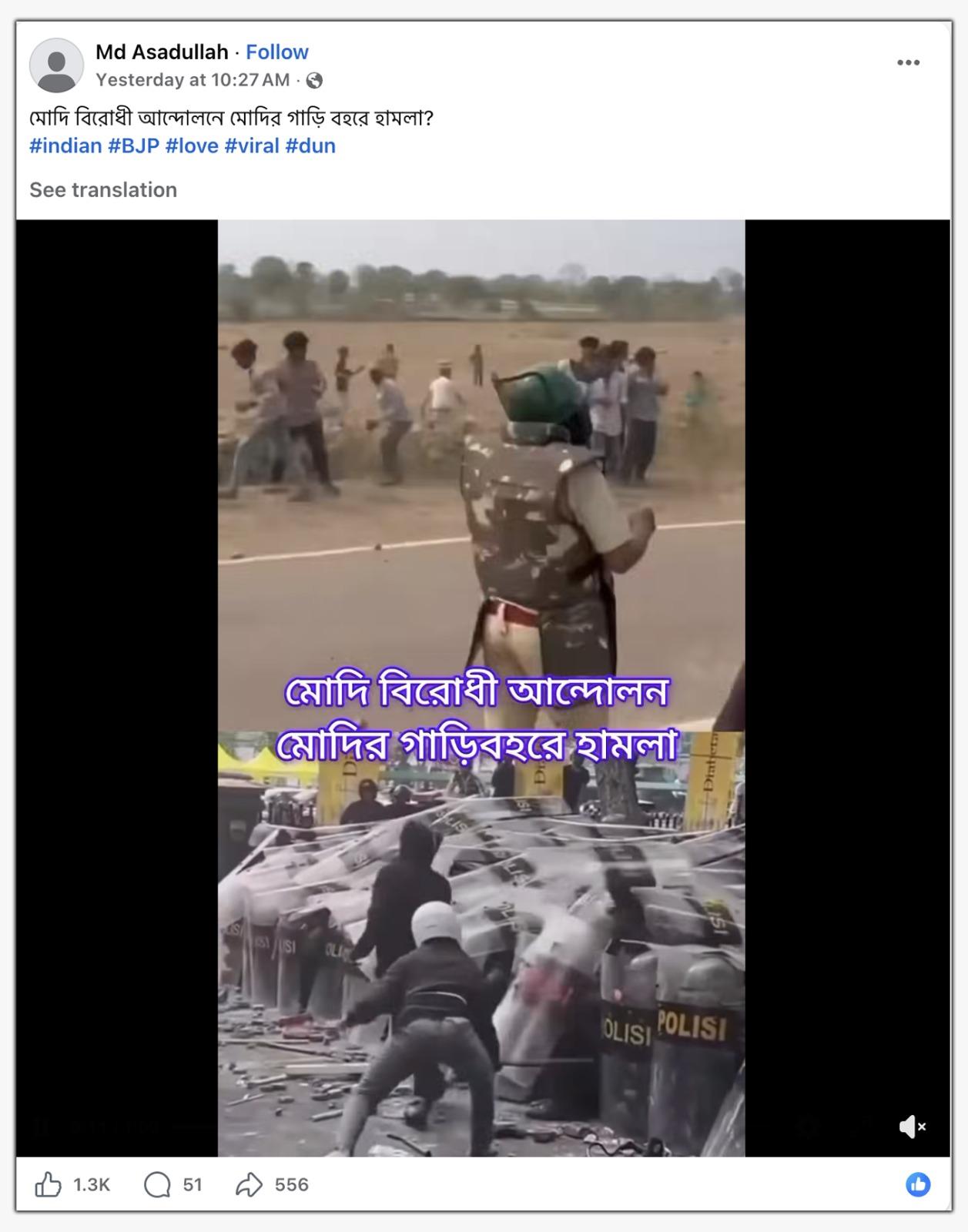 অন্যদিকে, দ্বিতীয় ক্লিপটিতে রায়ট শিল্ডের সাহায্যে পুলিশের তরফে করে রাখা ব্যারিকেড লক্ষ্য করে হামলা চালাতে এবং পাথর ছুড়তে দেখা যাচ্ছে বেশকিছু যুবককে। উভয় ক্লিপের সমন্বয়ে তৈরি ভিডিওটি শেয়ার করে দাবি করা হচ্ছে, সেটি বিক্ষোভকারীদের তরফে ভারতের প্রধানমন্ত্রী নরেন্দ্র মোদীর কনভয়ে হামলার দৃশ্য। উদাহরণস্বরূপ, ভাইরাল ভিডিওটি শেয়ার করে এক ফেসবুক ব্যবহারকারী লিখেছেন, “মোদি বিরোধী আন্দোলনে মোদির গাড়ি বহরে হামলা।”