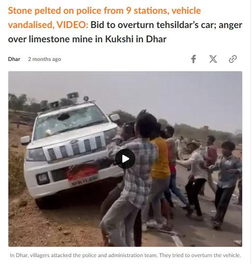 এরপর উক্ত সূত্র ধরে পরবর্তী অনুসন্ধান চালালে এই একই ভিডিও-সহ দৈনিক ভাস্করে এই সংক্রান্ত একটি প্রতিবেদন পাওয়া যায়। সেই প্রতিবেদন থেকে জানা যায়, চলতি বছরের ১৮ ফেব্রুয়ারি মধ্যপ্রদেশের ধার জেলার কুকশি থানার অন্তর্গত তালাওয়াড়ি গ্রামে একটি প্রস্তাবিত চুনাপাথরের খনি পরীক্ষা করতে যায় প্রশাসন এবং পুলিশের একটি দল। তখন স্থানীয় গ্রামবাসীরা, প্রস্তাবিত খনি থেকে চুনাপাথর উত্তোলন করা হলে তাদের কৃষি জমি অনুর্বর হয়ে যাবে এবং তাদেরকে বাস্তুচ্যুতিও হতে হবে দাবি করে অধিকারীকদের লক্ষ্য করে বিক্ষোভ প্রদর্শন শুরু করে। এক পর্যয়ে বিক্ষোভকারীরা প্রশাসনিক আধিকারীকদের উপরে হামলা চালাতে শুরু করে এবং তাদের গাড়ি লক্ষ্য করে পাথর ছোড়ে।