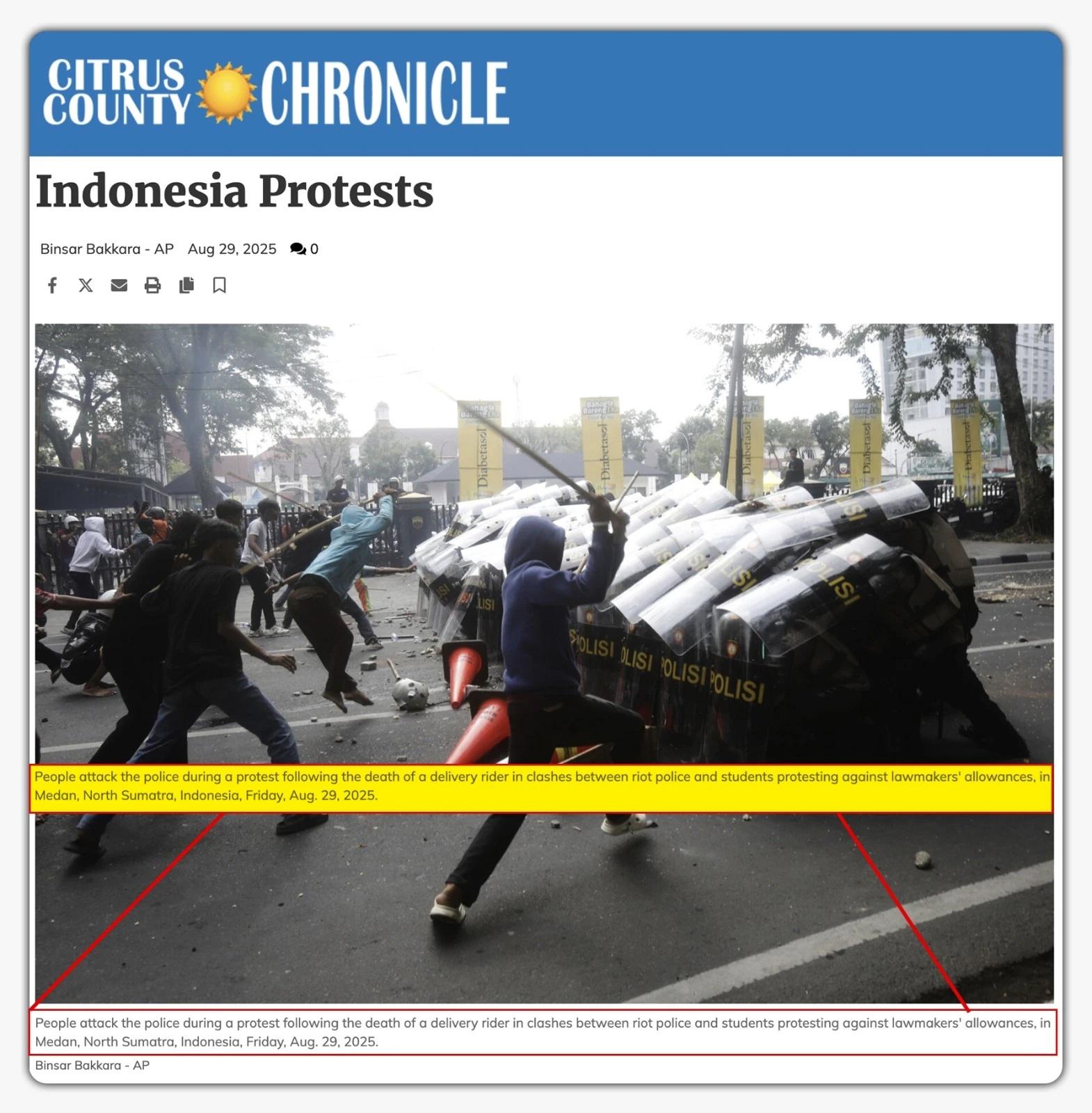 দ্বিতীয় ক্লিপ: অন্যদিকে ভাইরাল ভিডিও-র দ্বিতীয় ক্লিপটি সম্পর্কে জানতে সেটির একাধিক কি-ফ্রেম নিয়ে গুগলে রিভার্স ইমেজ সার্চ করা হয়। তখন ২০২৫ সালের ২ সেপ্টেম্বর ‘Nigerian Military Gallery’ নামক একটি ফেসবুক পেজে এই একই ভিডিও পাওয়া যায়। সেখানে ক্লিপটিকে ইন্দোনেশিয়ার বলে উল্লেখ করা হয়। এরপর উক্ত সূত্র ধরে পরবর্তী অনুসন্ধান চালালে ২০২৫ সালের ২৯ অগস্ট আমেরিকান সংবাদমাধ্যম ‘Citrus County Chronicle’এ এই একই স্থানে তোলা একই ঘটনার একটি ছবি-সহ একটি প্রতিবেদন পাওয়া যায়। সেখানে ছবিটির কৃতিত্ব অ্যাসোসিয়েটেড প্রেস সংবাদ সংস্থাকে দেওয়া হয়েছে।