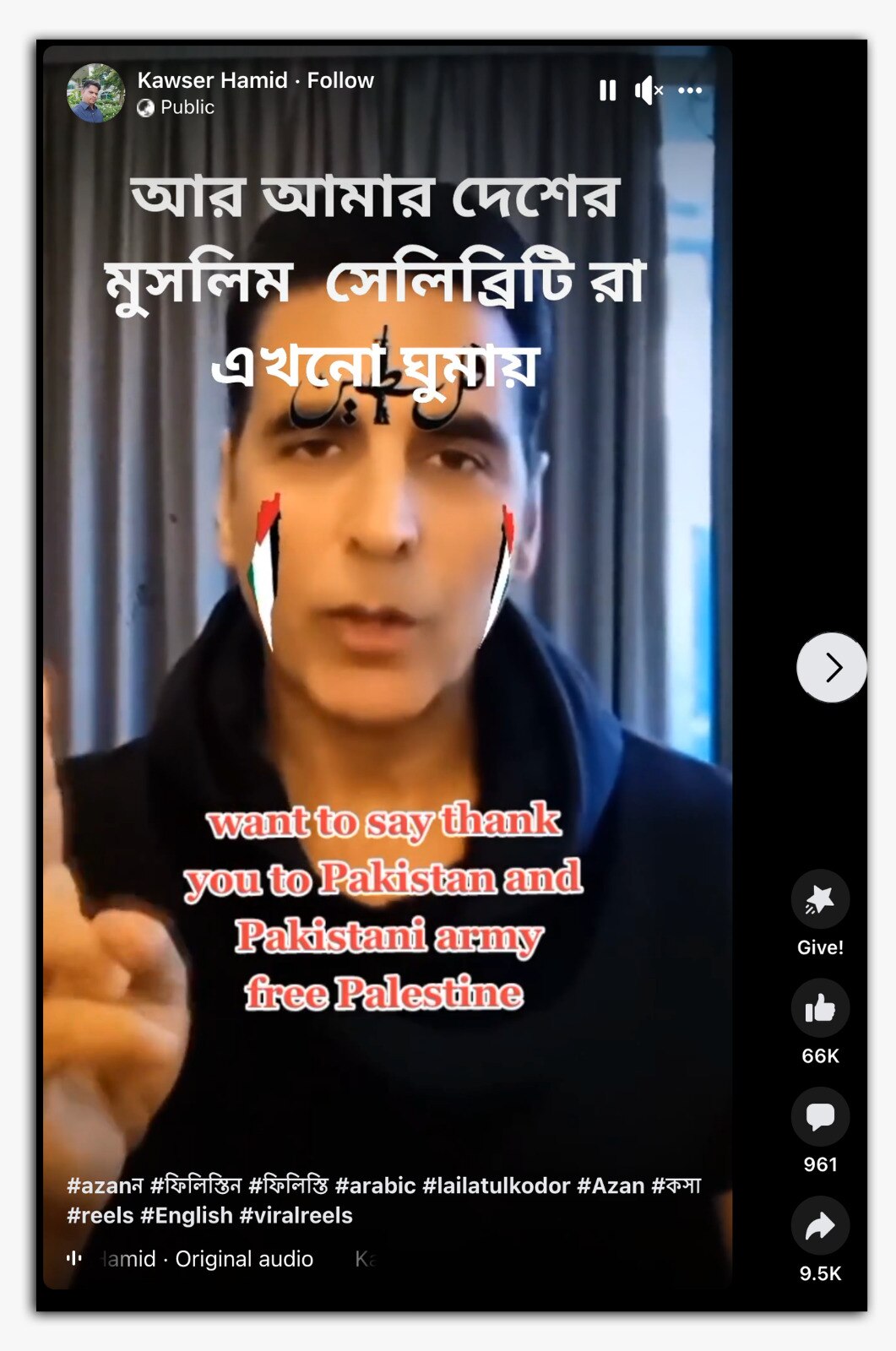 ভিডিয়োটিতে অক্ষয়কে বলতে শোনা যাচ্ছে, "আমি পাকিস্তান, পাকিস্তানি সেনা ও বিশ্বের সব মুসলিমদের ধন্যবাদ জানাতে চাই প্যালেস্তাইনকে সমর্থন করার জন্য। আমি প্যালেস্তাইনকে ভালবাসি, দয়া করে প্যালেস্তাইনকে স্বাধীনতা দেওয়া হোক।"