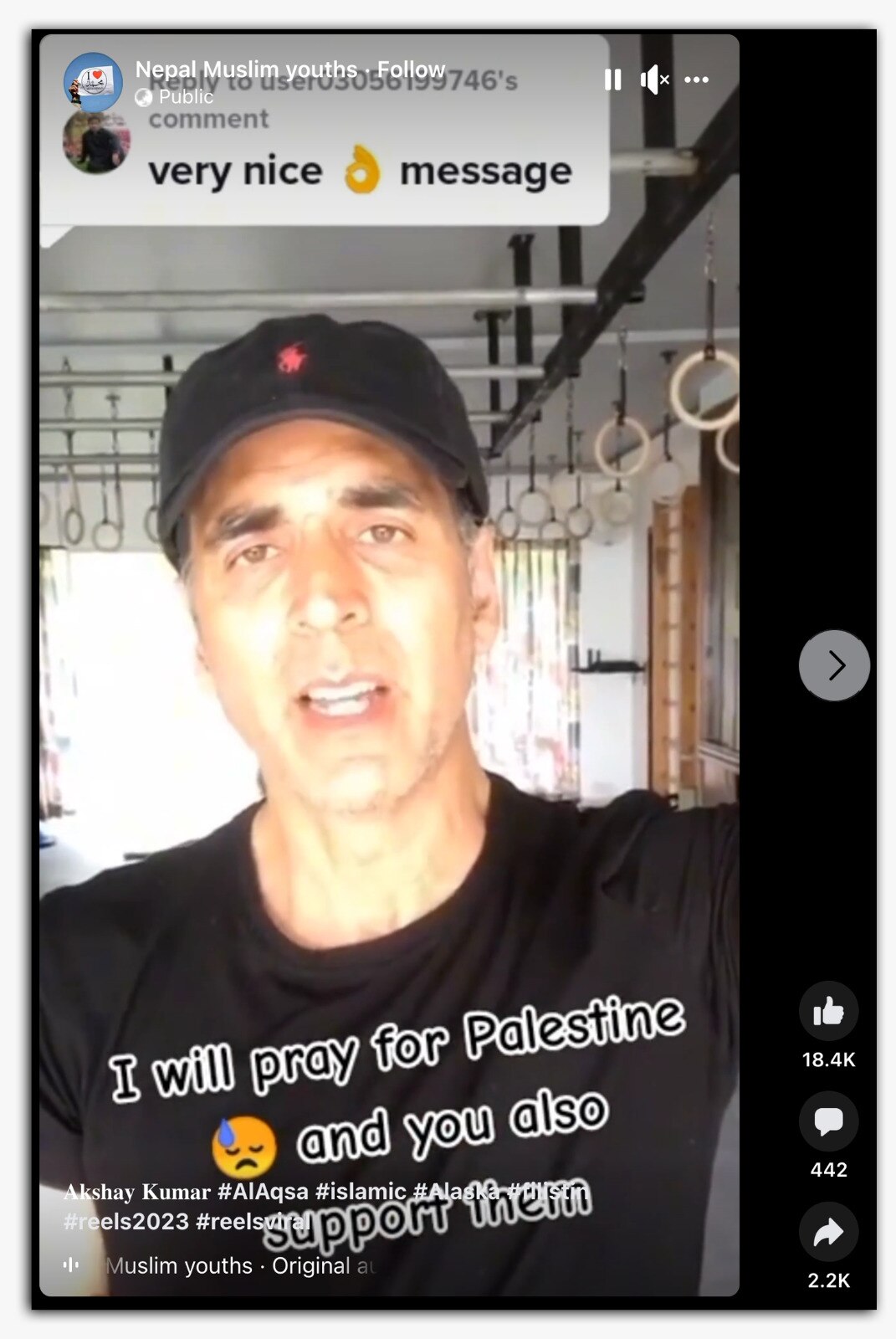 একই দাবি করে অক্ষয় কুমারের অন্য একটি ভিডিয়োও দেখা যাচ্ছে সামাজিক যোগাযোগ মাধ্যমে। সেখানে তাঁকে বলতে শোনা গিয়েছে যে প্যালেস্তাইনের জন্য যেন প্রার্থনা করা হয়। কারণ কেউ কেউ দেশটিকে শেষ করে দেওয়ার চেষ্টা করছে।