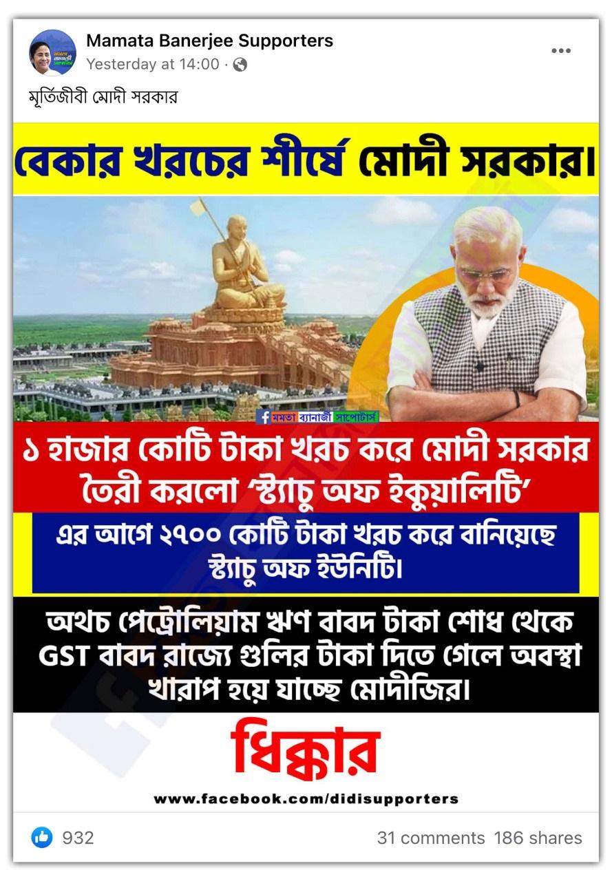 ভাইরাল পোস্টকার্ডে লেখা হয়েছে, "বেকার খরচের শীর্ষে মোদী সরকার। ১ হাজার কোটি টাকা খরচ করে মোদী সরকার তৈরী করলো স্ট্যাচু অফ ইকুয়ালিটি। এর আগে ২৭০০ কোটি টাকা খরচ করে বানিয়েছে স্ট্যাচু অফ ইউনিটি।" পোস্টকার্ডটি শেয়ার করে ক্যাপশনে লেখা হয়েছে, "মূর্তিজীবী মোদী সরকার।"