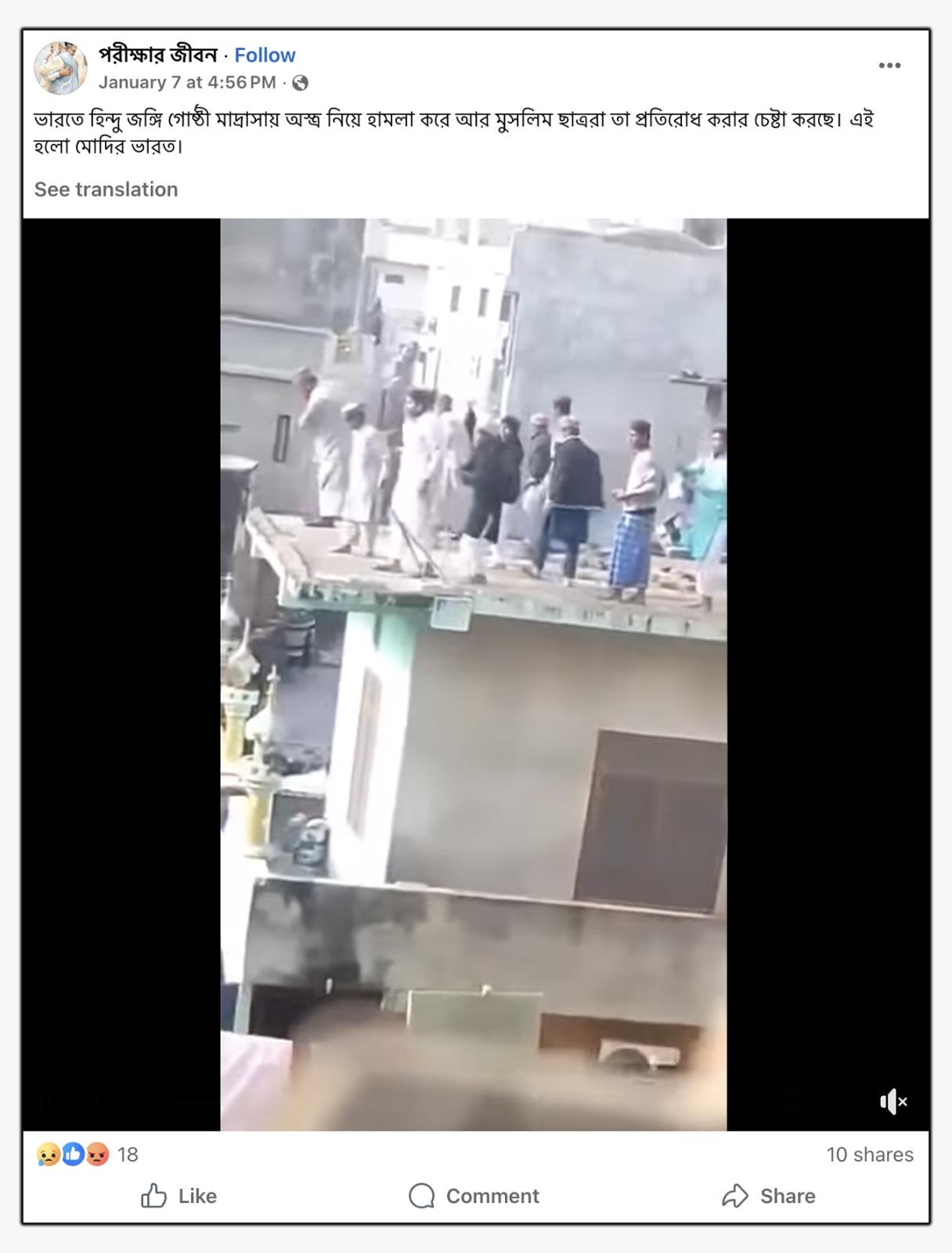 উদাহরণস্বরূপ, এক ফেসবুক ব্যবহারকারী ভাইরাল ভিডিওটি শেয়ার করে লিখেছেন, “ভারতে হিন্দু জঙ্গি গোষ্ঠী মাদ্রাসায় অস্ত্র নিয়ে হামলা করে আর মুসলিম ছাত্ররা তা প্রতিরোধ করার চেষ্টা করছে। এই হলো মোদির ভারত।” (সব বানান অপরিবর্তিত)
