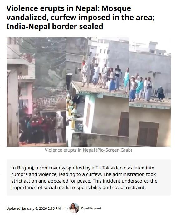 পাশাপশি, অভিযুক্তদের শাস্তির দাবিতে নেপালের একাধিক স্থানে বিক্ষোভ প্রদর্শন শুরু করে দেশটির হিন্দু সম্প্রদায়ের মানুষরা। এর মধ্যে চলতি বছরের ৩ জানুয়ারি ধনুষা জেলার কমলা পৌরসভার ৬ নম্বর ওয়ার্ডের একটি মসজিদে হামলা চালায় বিক্ষোভকারীরা। আর এই হামলার পরেই দেশ জুড়ে সাম্প্রদায়িক সংঘর্ষ ছড়িয়ে পড়ে। প্রতিবেদন থেকে আরও জানা যায়, বিক্ষোভ প্রথম শুরু হয় নেপালের পারসা জেলার বীরগঞ্জ শহরে। যা পরবর্তীতে সংঘর্ষের আকার নেয়। পারসা জেলা প্রশাসন বিহারের রক্সৌল জেলা সংলগ্ন এই বীরগঞ্জ শহরে কার্ফু জারি করে। অন্যদিকে নিরাপত্তা পরিস্থিতির অবনতির পরেই ভারত নেপালের সঙ্গে জরুরি পরিষেবা ছাড়া সমস্ত ধরনের আন্তঃসীমান্ত চলাচল সীমিত করেছে।