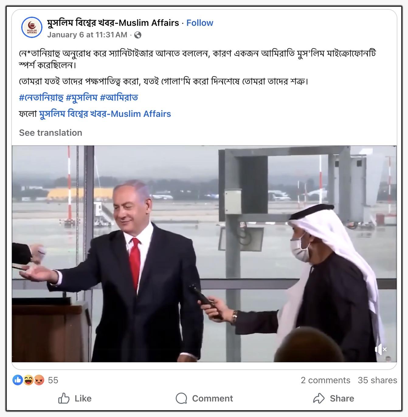 এরপর সেই ব্যক্তি নেতানিয়াহুর হাত স্যানিটাইজ করার পরেই তিনি মাইক্রোফোনটি হাতে নেন এবং নিজে সেটিকে স্যানিটাইজ করেন। ভিডিওটি শেয়ার করে দাবি করা হচ্ছে, সম্প্রতি আরবের এক মুসলিম ব্যক্তির থেকে মাইক্রোফোন নেওয়ার পর ধর্মীয় বিদ্বেষের কারণে বেঞ্জামিন নেতানিয়াহু নিজের হাত ও মাইক্রোফোনটি স্যানিটাইজ করেছেন। উদাহরণস্বরূপ, এক ফেসবুক ব্যবহারকারী ভাইরাল ভিডিওটি শেয়ার করে লিখেছেন, “নে*তানিয়াহু অনুরোধ করে স্যানিটাইজার আনতে বললেন, কারণ একজন আমিরাতি মুস'লিম মাইক্রোফোনটি স্পর্শ করেছিলেন।” (সব বানান অপরিবর্তিত)