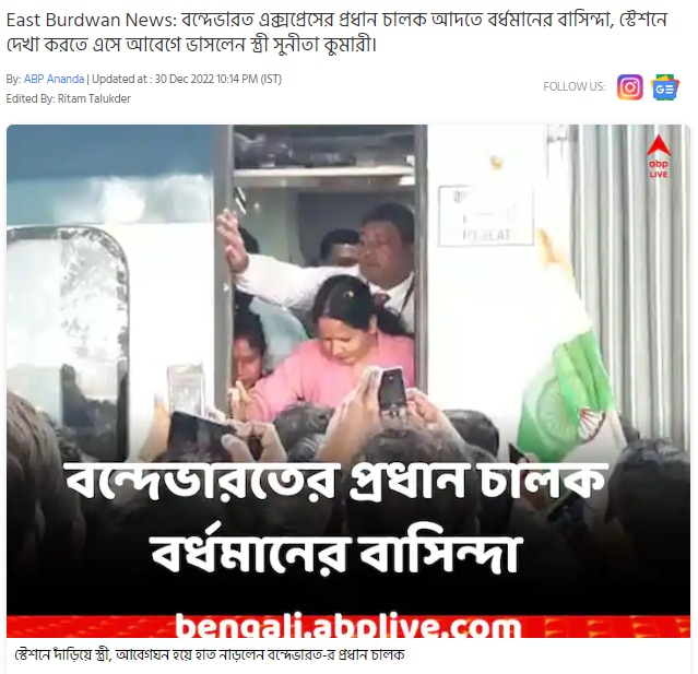 এবিপি আনন্দের একটি প্রতিবেদনও আমরা এই নিয়ে দেখতে পাই। সেখানে উল্লেখ পায়, "বন্দে ভারতের প্রধান চালক অনিল কুমার বর্ধমানের বাসিন্দা। তিনি যখন ট্রেন চালিয়ে নিয়ে বর্ধমান স্টেশনে যান, তখন তাঁর স্ত্রী সুনীতা দেবীও তাঁর সঙ্গে দেখা করতে আসেন। এবিপি আনন্দ প্রকাশিত প্রতিবেদন অনুযায়ী, সুনীতা কুমারী জানান, ১৯৯০ সালে রেলের অ্যাসিন্ট্যান্ট ড্রাইভার হিসাবে কাজে যোগ দেন অনিল কুমার। বরাবরই কর্মপ্রিয় অনিল কুমারের লক্ষ্য ছিল, সবথেকে গুরত্বপূর্ণ ট্রেনগুলো চালানো। বিভিন্ন মেল, এক্সপ্রেস চালানোর পাশাপাশি পূর্বা, শতাব্দি, রাজধানী ও দুরন্ত ট্রেনও চালিয়েছেন তিনি। চলতি মাসের ৭ তারিখে বন্দে ভারত এক্সপ্রেস চালানোর জন্য স্পেশাল ট্রেনিংয়েএ উত্তরপ্রদেশের গাজিয়াবাদে যান। ট্রেনিং শেষে ১৯ তারিখ তিনি বর্ধমানের বাড়িতে ফিরে আসেন।"