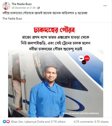 বাংলার প্রথম বন্দে ভারতের চালক নদীয়ার শুভেন্দু নয়, ফেসবুকে ছড়াল মিথ্যা দাবিপূর্ব ভারতের রেল মানচিত্রে ৩০ ডিসেম্বর ছিল একটি স্মরণীয় দিন। এই দিনই হাওড়া স্টেশন থেকে সূচনা হয় পূর্ব ভারতের প্রথম সেমি হাই স্পিড বুলেট ট্রেন বন্দে ভারত এক্সপ্রেসের। এই অনুষ্ঠানে প্রধানমন্ত্রী নরেন্দ্র মোদীর উপস্থিত থাকার কথা থাকলেও তাঁর মায়ের পরলোকগমনের কারণে তিনি ভার্চুয়ালি এই অনুষ্ঠানে যোগ দেন। হাওড়া থেকে ছেড়ে ট্রেনটি যায় নিউ জলপাইগুড়ি পর্যন্ত।