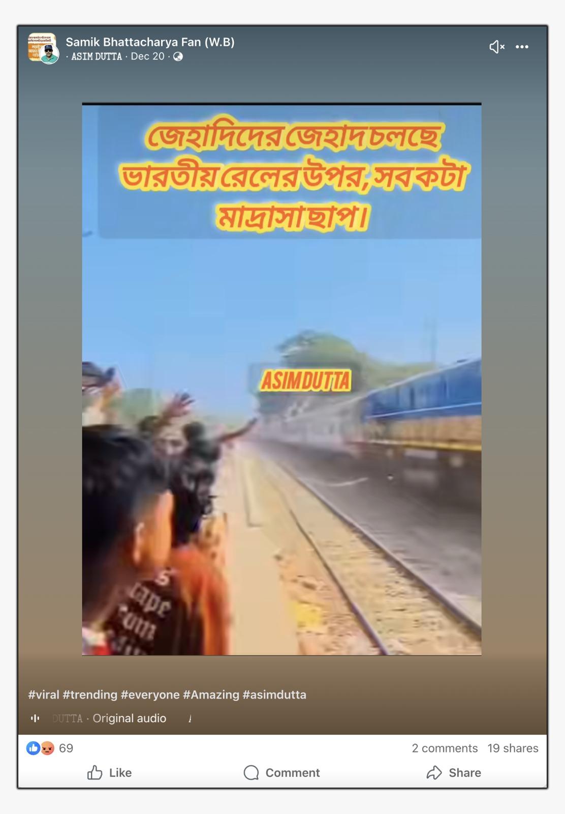 ভিডিওটি পোস্ট করে তার সঙ্গে লেখা হয়েছে, “জেহাদিদের জেহাদ চলছে ভারতীয় রেলের উপর, সব কটা মাদ্রাসা ছাপ।” (ক্যাপশনের সকল বানান অপরিবর্তিত)
