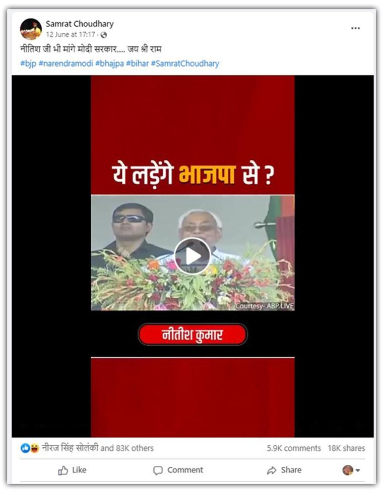 এছাড়া BJP Madhya Pradesh-এর অফিসিয়াল ফেসবুক পেজেও ভিডিয়োটি একই দিনে আপলোড হতে দেখা যায়। সেটা ২০১৯ সালের লোকসভা ভোটের প্রচারের ভিডিয়ো। যখন নীতীশ কুমার এনডিএ-তে বিজেপির জোটসঙ্গী ছিলেন।