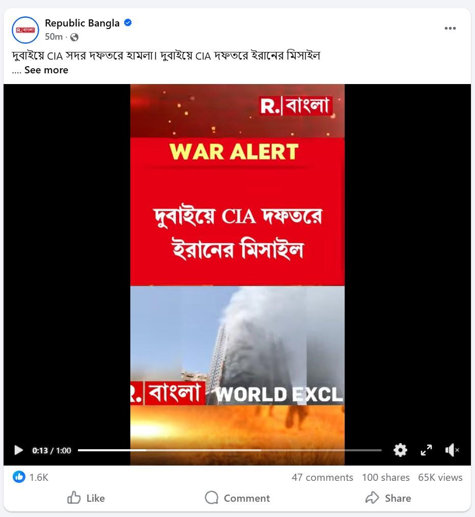 প্রথম ক্লিপটিতে কোনও একটি বহুতল আবাসনে আগুন জ্বলতে দেখা যাচ্ছে। ভিডিওটি শেয়ার করে দাবি করা হচ্ছে, সেটি ইরানের তরফে দুবাইয়ে অবস্থিত CIA-এর সদর দফতরে বিমান হামলার দৃশ্য। উদাহরণস্বরূপ, ভাইরাল ক্লিপটি শেয়ার করে এক ফেসবুক ব্যবহারকারী লিখেছেন, “আলহামদুলিল্লাহ এই মাত্র দুবাইয়ে আমেরিকার CIA সদর দফতরে হামলা। দুবাইয়ে CIA দফতরে ইরানের মিসাইল হামলা।। জ্বলছে আ*গু*ন…” এমনকি রিপাবালিক বাংলা এবং জি নিউজ-সহ একাধিক সংবাদমাধ্যমের তরফেও এই একই ভিডিও একই দাবি-সহ শেয়ার করা হয়েছে।