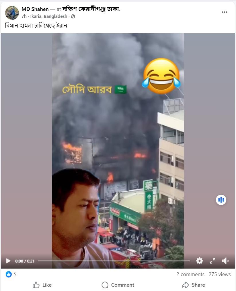 অন্যদিকে দ্বিতীয় ক্লিপটিতে কোনও একটি শহরের প্রাণ কেন্দ্রে অবস্থিত একটি বিল্ডিংয়ে দাউদাউ করে আগুন জ্বলতে দেখা যাচ্ছে। আগুন নেভানোর চেষ্টা করছেন দমকল কর্মীরা। দ্বিতীয় ক্লিপটি শেয়ার করে দাবি করা হচ্ছে, সৌদি আরবে অবস্থিত মার্কিন সেনা ঘাঁটিতে বিমান হামলা চালিয়েছে ইরান। উদাহরণস্বরূপ, ভাইরাল ক্লিপটি শেয়ার করে এক ফেসবুক ব্যবহারকারী লিখেছেন, “বিমান হামলা চালিয়েছে ইরান।” পাশাপাশি, ভিডিও-র ফ্রেমের উপরে লেখা হয়েছে, “সৌদি আরব।”
