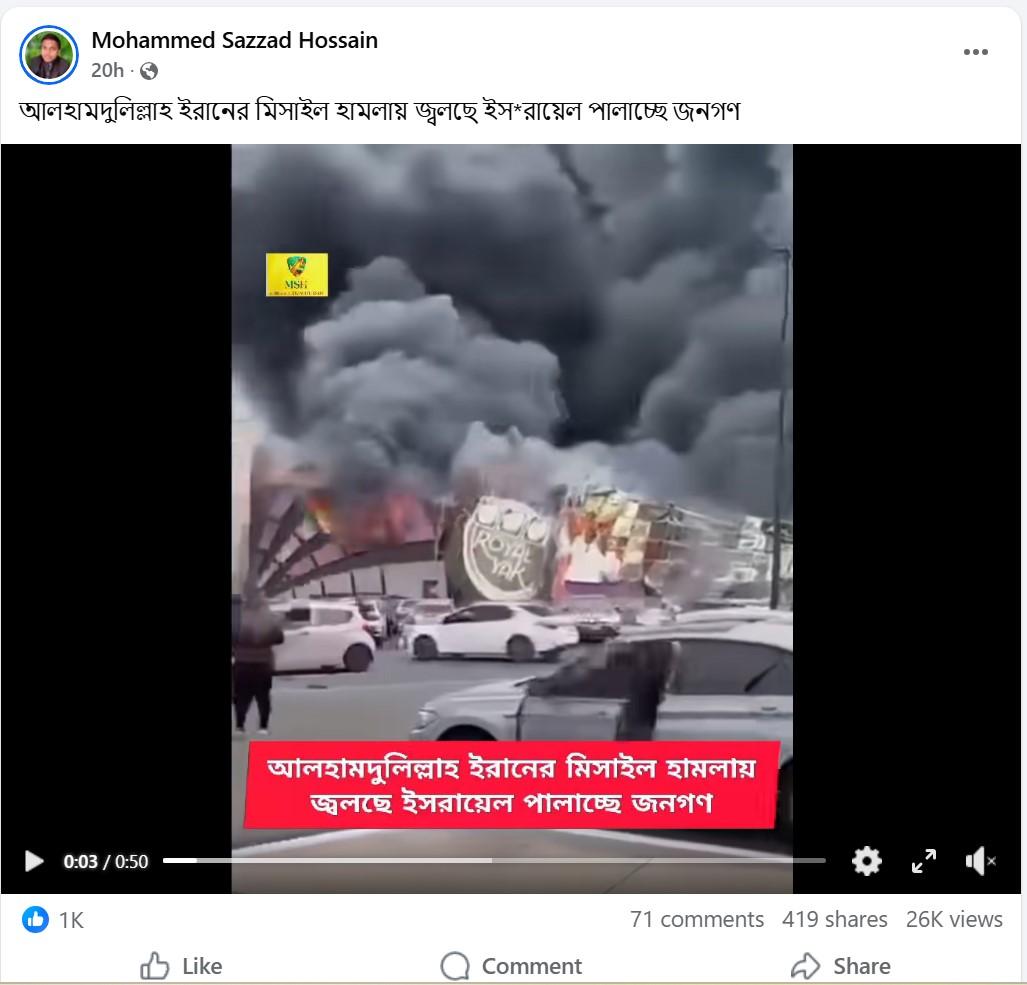 সবশেষে তৃতীয় ক্লিপটিতে কোনও একটি ব্যস্ত রাস্তা পাশে থাকা একটি বিল্ডিংয়ে ব্যপকভাবে আগুন জ্বলতে ও ধোঁয়া উড়তে দেখা যাচ্ছে। ভিডিওটি শেয়ার করে দাবি করা হচ্ছে, সেটি ইজরায়েলের মাটিতে ইরানের ক্ষেপণাস্ত্র হামলার দৃশ্য। উদাহরণস্বরূপ, ভাইরাল ক্লিপটি শেয়ার করে এক ফেসবুক ব্যবহারকারী লিখেছেন, “আলহামদুলিল্লাহ ইরানের মিসাইল হামলায় জ্বলছে ইস*রায়েল পালাচ্ছে জনগণ।”
