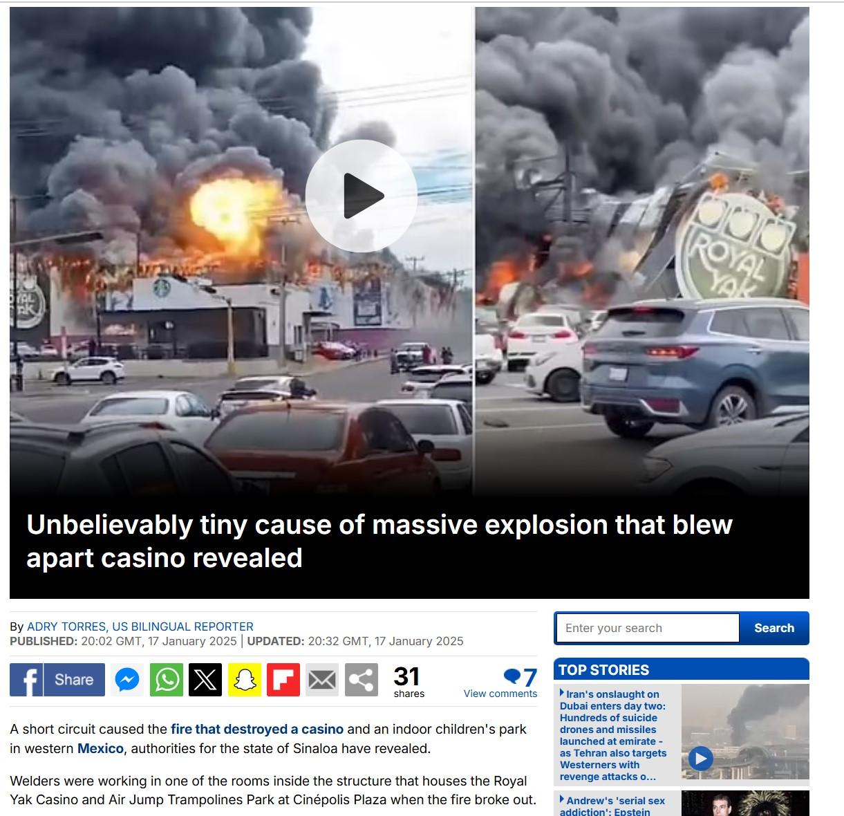 তৃতীয় ক্লিপটি নিয়ে অনুসন্ধান চালানোর সময়ও আমপা লক্ষ্য করি সেটির সঙ্গেও ইরান-ইজরায়েল-আমেরিকার সঙ্গে চলমান সাম্প্রতিক সংঘাতের কোনও সম্পর্ক নেই। বরে ক্লিপটি ২০২৫ সালের ১৬ জানুয়ারি মেক্সিকোর সিনালোয়া প্রদেশের সিনেপোলিস প্লাজার রয়্যাল ইয়াক ক্যাসিনো এবং এয়ার জাম্প ট্রাম্পোলাইনস পার্কে ওয়েল্ডিং কাজ চলাকালীন আগুন লাগার দৃশ্য। সেই সময় মিরর ইউকে এবং ডেইলি স্টার-সহ একাধিক সংবাদমাধ্যমে ভাইরাল ভিডিও এবং সেটির একাধিক স্ক্রিন-সহ প্রতিবেদন প্রকাশ করা হয়েছিল।