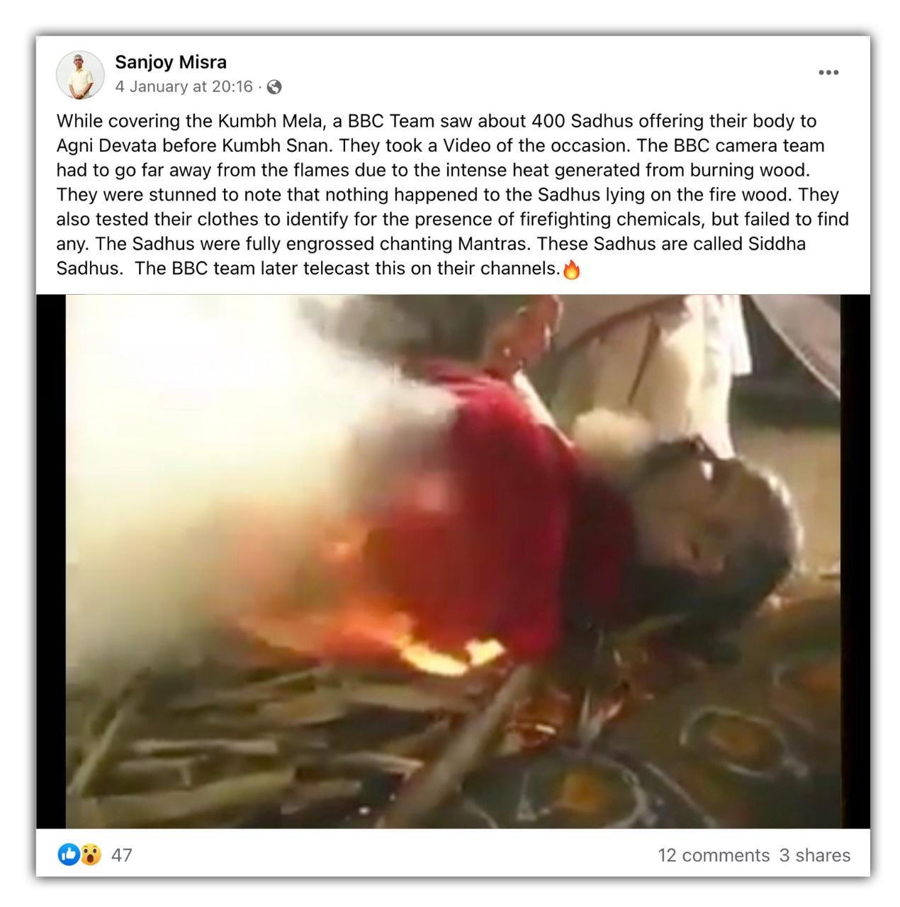সঞ্জয় মিশ্র নামের এক ব্যক্তি এই ভিডিওটি ফেসবুকে পোস্ট করে ইংরাজিতে লিখেছেন, "কুম্ভ মেলার খবর করার সময় বিবিসি-র একটি দল দেখতে পান ৪০০ জন সাধু কুম্ভস্নানের আগে নিজেদের দেহ আগুনে অর্পণ করছে। তারা ঘটনাটি ক্যামেরা বন্দি করে রাখে। কাঠের আগুনে শুয়ে থাকার পরও সাধুদের কিছু হচ্ছে না দেখে বিবিসি-র প্রতিনিধিরা চমকে গিয়েছিলেন। কাপড়ে কোনও রাসায়নিক মেশানো রয়েছে কিনা তার পরীক্ষাও তারা করেন, কিন্তু কিছু পাওয়া যায়নি। পরে বিবিসি এটি তাদের চ্যানেলে সম্প্রচার করে।"