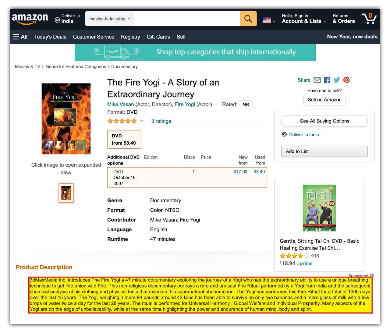 কি-ওয়ার্ড সার্চের মাধ্যমে এরপরই আমরা বিখ্যাত অনলাইন শপিং বিপণী অ্যামাজনের ওয়েবসাইটে ওই তথ্যচিত্রটির ডিভিডি দেখতে পাই। ২০০৭ সালে প্রকাশ পাওয়া সেই তথ্যচিত্রের ডিভিডি সেখানে বিক্রি করা হচ্ছিল। যদিও মজার ব্যাপার হল- ভারতীয় অ্যামাজনের ওয়েবসাইট অর্থাৎ Amazon.in-এ তথ্যচিত্রটি বিক্রির জন্য পাওয়া যায়নি। কিন্তু অ্যামাজনের মার্কিন ওয়েবসাইট, অর্থাৎ Amazon.com-এ সেটি ৩.৪০ ডলারে বিক্রি করা হচ্ছিল।