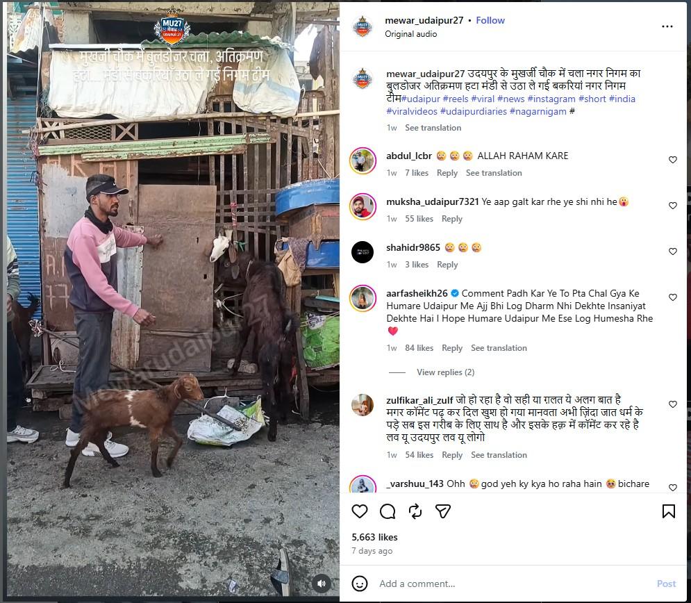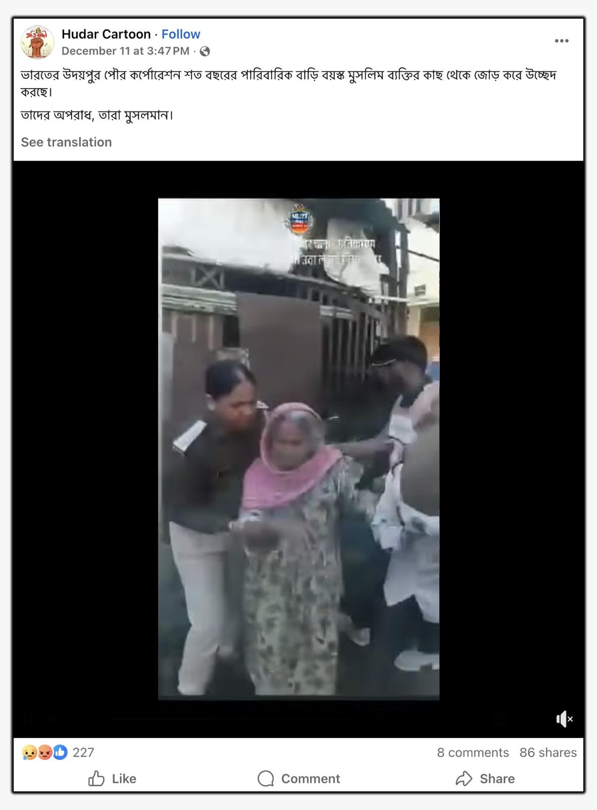 উদাহরণস্বরূপ, এক ফেসবুক ব্যবহারকারী ভাইরাল ভিডিওটি শেয়ার করে লিখেছেন, “ভারতের উদয়পুর পৌর কর্পোরেশন শত বছরের পারিবারিক বাড়ি বয়স্ক মুসলিম ব্যক্তির কাছ থেকে জোড় করে উচ্ছেদ করছে। তাদের অপরাধ, তারা মুসলমান।” (সব বানান অপরিবর্তিত)