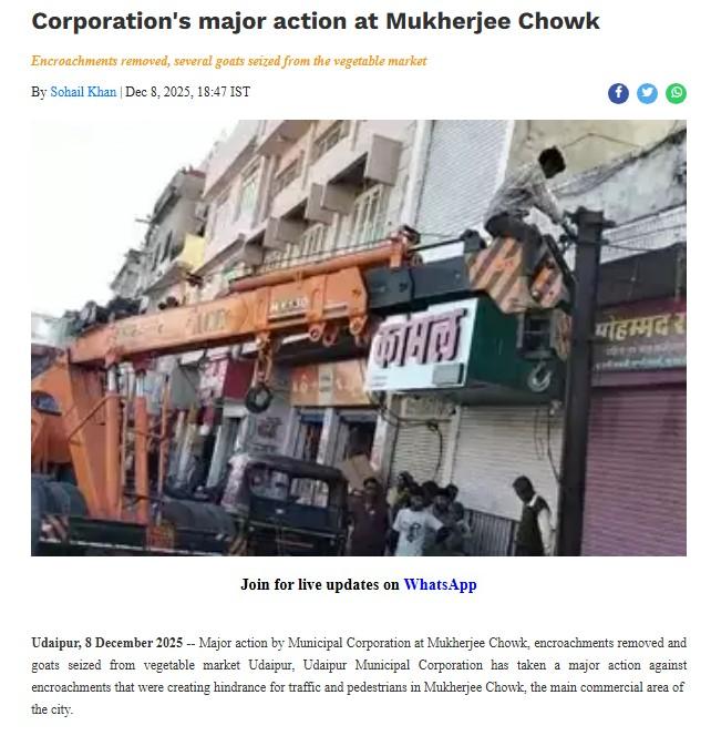 এরপর এই সংক্রান্ত পরবর্তী অনুসন্ধান চালালে চলতি বছরের ৮ ডিসেম্বর উদয়পুর টাইমসে একটি প্রতিবেদন পাওয়া যায়। সেই প্রতিবেদন থেকে জানা যায়, ৮ ডিসেম্বর উদয়পুরের মুখার্জি চকে অবৈধ দখলের বিরুদ্ধে অভিযান চালায় পুরনিগম। সেই সময় জনসাধারণের রাস্তা পরিষ্কার ও যান চলাচল সহজ করার লক্ষ্যে স্থানীয় সবজি বাজার থেকে দখল অপসারণ এবং কয়েকটি ছাগল আটক করে পুরনিগম নিগমের আধিকারিকরা। তবে প্রতিবেদনের কোথাও কোনও মুসলিম ব্যক্তির ১০০ বছরের পৈতৃক বাড়ি উচ্ছেদ সংক্রান্ত কোনও তথ্য পাওয়া যায়নি।