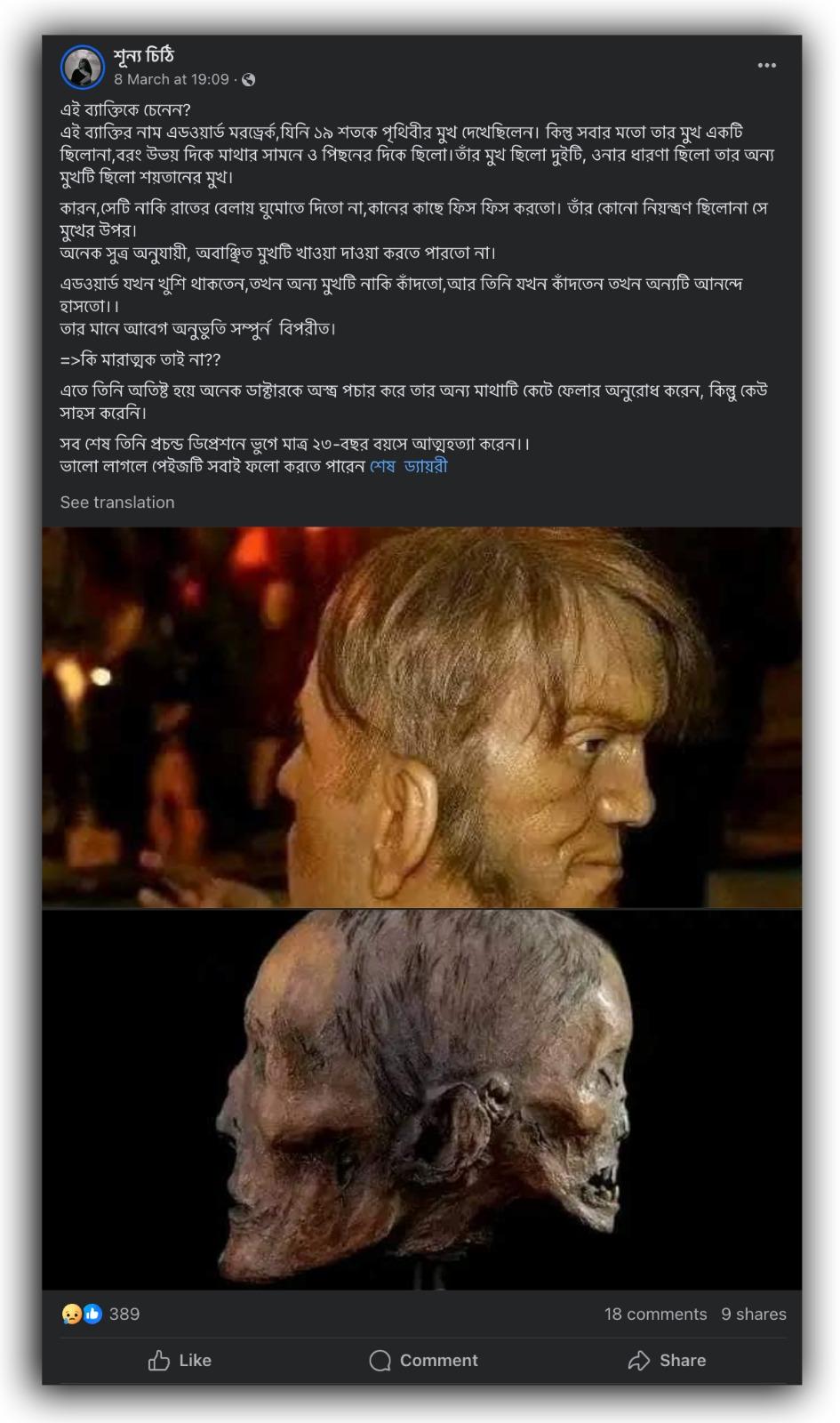 উদাহরণস্বরূপ, গত ৮ মার্চ এক ফেসবুক ব্যবহারকারী ছবিটি শেয়ার করে লিখেছেন, “এই ব্যাক্তিকে চেনেন? এই ব্যাক্তির নাম এডওয়ার্ড মরড্রের্ক,যিনি ১৯ শতকে পৃথিবীর মুখ দেখেছিলেন। কিন্তু সবার মতো তার মুখ একটি ছিলোনা,বরং উভয় দিকে মাথার সামনে ও পিছনের দিকে ছিলো।তাঁর মুখ ছিলো দুইটি, ওনার ধারণা ছিলো তার অন্য মুখটি ছিলো শয়তানের মুখ। কারন,সেটি নাকি রাতের বেলায় ঘুমোতে দিতো না,কানের কাছে ফিস ফিস করতো। তাঁর কোনো নিয়ন্ত্রণ ছিলোনা সে মুখের উপর। অনেক সুত্র অনুযায়ী, অবাঞ্ছিত মুখটি খাওয়া দাওয়া করতে পারতো না। এডওয়ার্ড যখন খুশি থাকতেন,তখন অন্য মুখটি নাকি কাঁদতো,আর তিনি যখন কাঁদতেন তখন অন্যটি আনন্দে হাসতো।। তার মানে আবেগ অনুভুতি সম্পুর্ন বিপরীত। =>কি মারাত্মক তাই না?? এতে তিনি অতিষ্ট হয়ে অনেক ডাক্টারকে অস্ত্র পচার করে তার অন্য মাথাটি কেটে ফেলার অনুরোধ করেন, কিন্তুু কেউ সাহস করেনি। সব শেষ তিনি প্রচন্ড ডিপ্রেশনে ভুগে মাত্র ২৩-বছর বয়সে আত্মহত্যা করেন।।” (ক্যাপশনের সব বানান অপরিবর্তিত)