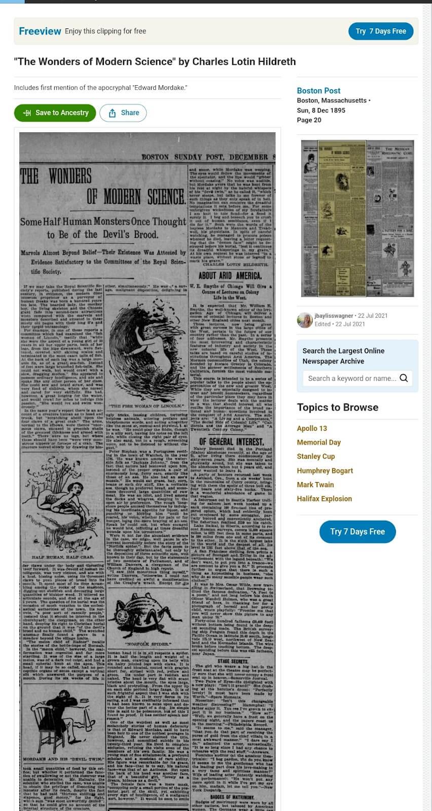 তবে কিওয়ার্ড ও রিভার্স ইমেজ সার্চ করার সময় আমরা দেখতে পাই ১৮৯৫ সালের ৮ ডিসেম্বর আমেরিকান লেখক চার্লস লটিন হিলড্রেক ‘এডওয়ার্ড মরড্রেকট’ নামক চরিত্রটিকে নিয়ে ‘The Boston Sunday Post’ পত্রিকার ২০ নম্বর পৃষ্ঠায় একটি কাল্পনিক গল্প প্রকাশ করেন।