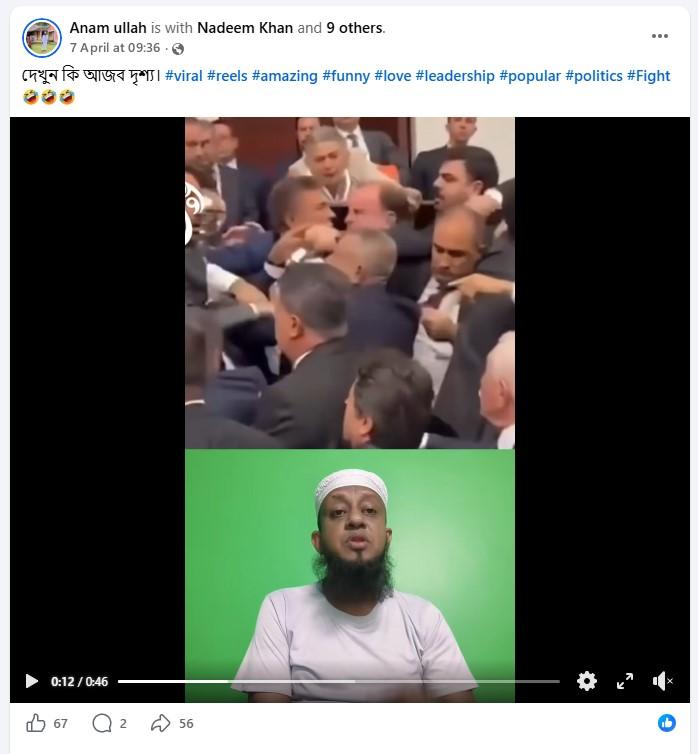 আর এই সার্বিক পরিস্থিতির মধ্যে সামাজিক যোগাযোগ মাধ্যমে বেশ ভাইরাল হয়েছে একটি ভিডিও। যেখানে কোনও একটি দেশের সংসদের মধ্যে সাংসদদের একে অপরের সঙ্গে হাতাহাতিতে করতে দেখা যাচ্ছে। ভাইরাল ভিডিওটি শেয়ার করে এক ফেসবুক ব্যবহারকারী সেটির ব্যাকগ্রাউন্ডে ভয়েসওভারের মাধ্যমে দাবি করেছেন, ইরান ও প্যালেস্তাইনের উপর হামলা বন্ধের দাবিতে ইজরায়েলের সাংসদে মারপিট করছে সে দেশের সাংসদরা।