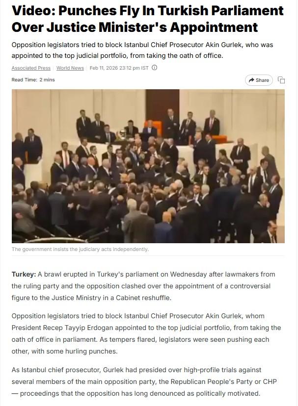এরপর উক্ত সূত্র ধরে পরবর্তী অনুসন্ধান চালালে এই একই ভিডিও-র স্ক্রিনশট-সহ একাধিক সংবাদমাধ্যমে এই সংক্রান্ত প্রতিবেদন পাওয়া যায়। সেই সব প্রতিবেদন থেকে জানা যায়, ২০২৬ সালের ১১ ফেব্রুয়ারি তুরস্কের পার্লামেন্টে (গ্র্যান্ড ন্যাশনাল অ্যাসেম্বলি) এক ভয়াবহ হাতাহাতি ও বিশৃঙ্খলার ঘটনা ঘটে। সম্প্রতি তুরস্কের প্রেসিডেন্ট রিচেপ তাইপ এয়ারডোয়ান দেশের নতুন বিচারমন্ত্রী হিসাবে আকিন গুরলেককে নিযুক্ত করেন। অন্যদিকে প্রধান বিরোধী দল রিপাবলিকান পিপলস পার্টি (CHP) শুরু থেকেই এই নিয়োগের কড়া বিরোধিতা করে আসছিল। গুরলেকের বিরুদ্ধে বিরোধী সাংসদের অভিযোগ, তিনি ইস্তাম্বুলের প্রধান প্রসিকিউটর থাকাকালীন রাজনৈতিক উদ্দেশ্যপ্রণোদিতভাবে বিরোধী নেতাদের ওপর দমন-পীড়ন চালিয়েছেন।