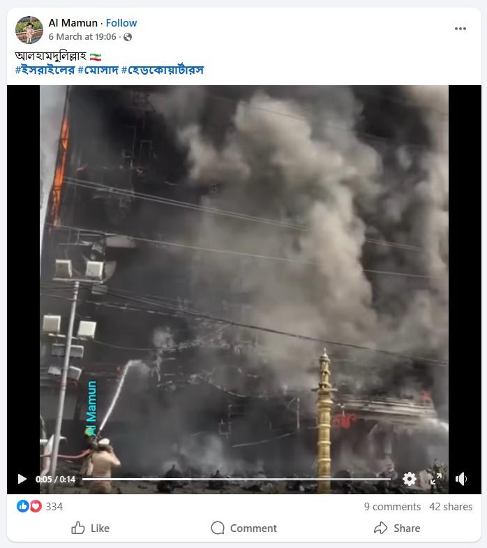 যেখানে প্রথম ভিডিওতে একটি বহুতল ভবনে আগুন জ্বলতে এবং সেটি থেকে কালো ধোঁয়া উড়তে দেখা যাচ্ছে। অন্যদিকে, নীচ থেকে জল দিয়ে আগুন নেভানোর চেষ্টা করছেন কয়েকজন দমকল কর্মী। ভিডিওটি শেয়ার করে দাবি করা হচ্ছে, সেটি ইজরায়েলের জাতীয় গোয়েন্দা সংস্থা মোসাদের সদর দফতরে ইরানের ক্ষেপণাস্ত্র হামলার দৃশ্য। উদাহরণস্বরূপ, ইরানের পতাকা-সহ ভাইরাল ক্লিপটি শেয়ার করে এক ফেসবুক ব্যবহারকারী লিখেছেন, “আলহামদুলিল্লাহ, ইসরাইলের মোসাদ হেডকোয়ার্টারস।”