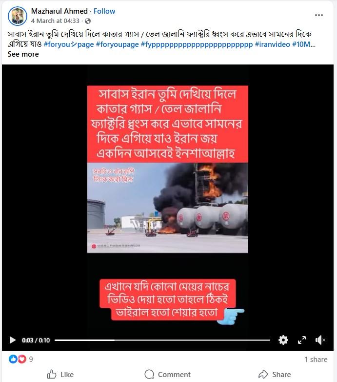 অন্যদিকে দ্বিতীয় ভিডিওতে কোনও একটি তেল শোধনাগার জাতীয় স্থানে দাউদাউ করে আগুন জ্বলতে দেখা যাচ্ছে। আর জল দিয়ে সেই আগুন নেভানোর চেষ্টা করছে কয়েকটি ছোট রোবট জাতীয় গাড়ি। ভিডিওটি শেয়ার করে দাবি করা হচ্ছে, সেটি কাতারের তেল শোধনাগারে ইরানের হামলার দৃশ্য। উদাহরণস্বরূপ, ভাইরাল ক্লিপটি শেয়ার করে এক ফেসবুক ব্যবহারকারী লিখেছেন, “সাবাস ইরান তুমি দেখিয়ে দিলে কাতার গ্যাস / তেল জালানি ফ্যাক্টরি ধ্বংস করে এভাবে সামনের দিকে এগিয়ে যাও।”