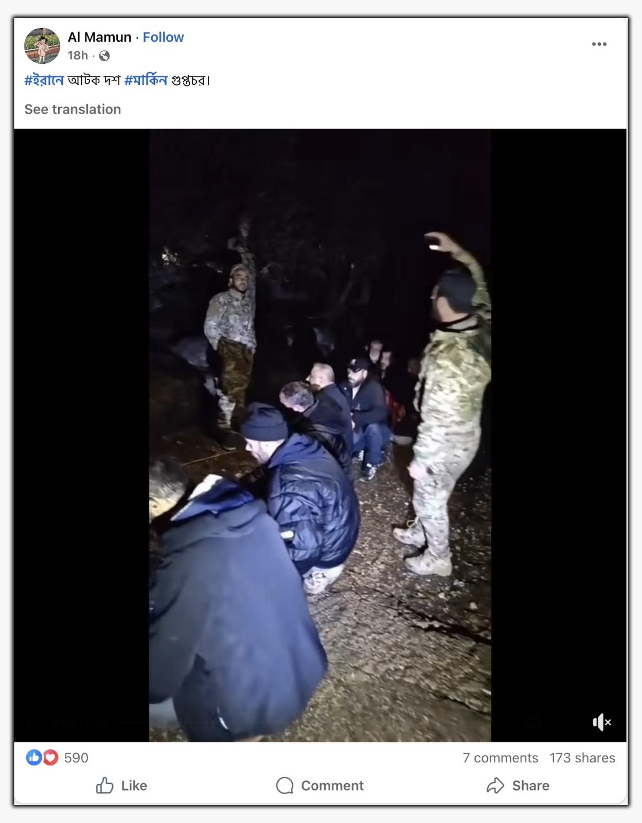 আর এই সার্বিক পরিস্থিতির মধ্যে সামাজিক যোগাযোগ মাধ্যমে বেশ ভাইরাল হয়েছে একটি ভিডিও। যেখানে গায়ে নীল রঙের জ্যাকেট পরিহিত কয়েকজন ব্যক্তিকে মাটিতে বসে রয়েছেন এবং তাদেরকে ঘিরে রেখেছেন কয়েকজন সেনাকর্মী। ভিডিওটি শেয়ার করে দাবি করা হচ্ছে, সম্প্রতি ইরানে লুকিয়ে থাকা দশজন মার্কিন গুপ্তচরকে আটক করেছে ইরানি সেনাবাহিনী। উদাহরণস্বরূপ, ভাইরাল ক্লিপটি শেয়ার করে এক ফেসবুক ব্যবহারকারী লিখেছেন, “ইরানে আটক দশ মার্কিন গুপ্তচর।”