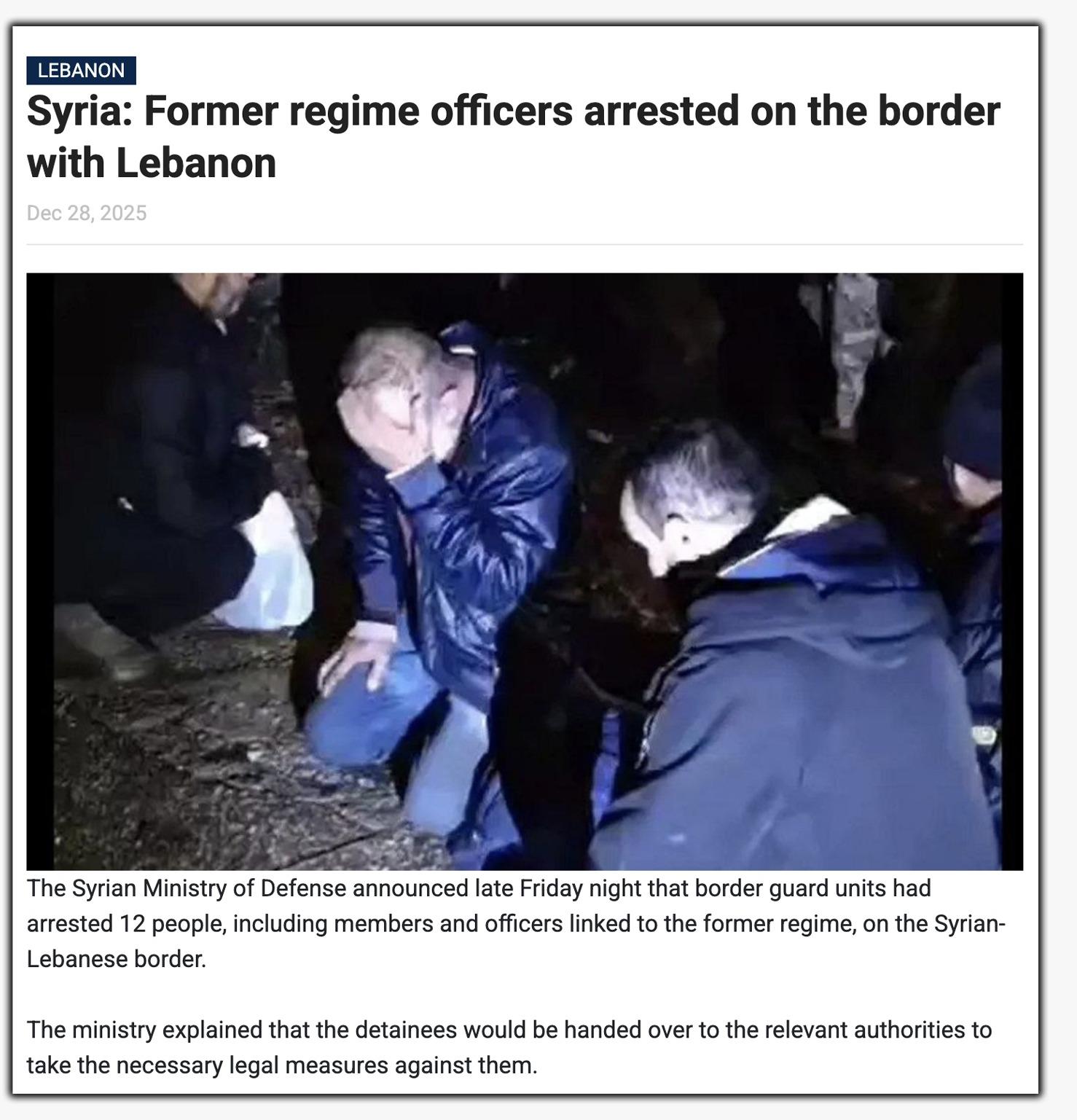 Border guard forces 𝗮𝗿𝗿𝗲𝘀𝘁𝗲𝗱 𝟭𝟮 𝗼𝗳𝗳𝗶𝗰𝗲𝗿𝘀 from the ousted 𝗔𝘀𝘀𝗮𝗱 𝗿𝗲𝗴𝗶𝗺𝗲 who tried to enter the country illegally via the Syrian-Lebanese border. pic.twitter.com/gIernAcab8