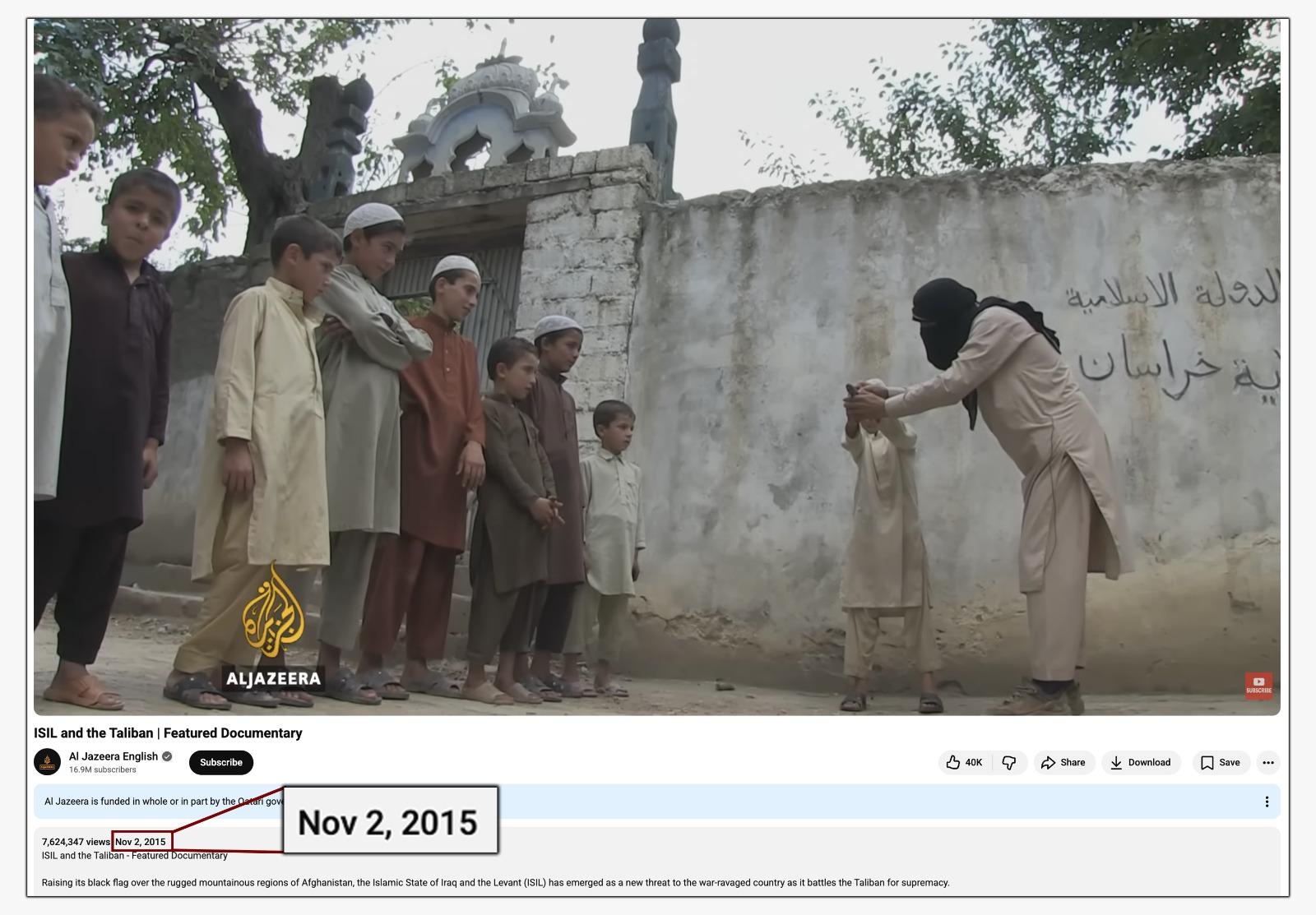 ভাইরাল ভিডিওটি থেকে স্ক্রিনশট সংগ্রহ করে তার রিভার্স ইমেজ সার্চ করা হলে ওই একই ক্লিপ পাওয়া যায় আল জাজিরার একটি ডকুমেন্টারি ভিডিওতে। “ISIL and the Taliban | Featured Documentary” শিরোনামের এই ডকুমেন্টারি আল জাজিরার ইউটিউব চ্যানেলে আপলোড করা হয়েছিল ২০১৫ সালের ২ নভেম্বর।