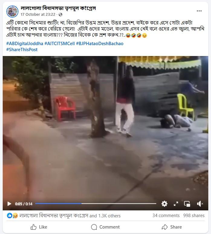 উদাহরণস্বরূপ, এক ফেসবুক ব্যবহারকারী ভাইরাল ভিডিওটি শেয়ার করে লিখেছেন, “এটি কোনো সিনেমার শ্যুটিং না, বিজেপির উত্তম প্রদেশ, উত্তর প্রদেশ, বাইকে করে এসে গোটা একটা পরিবার কে শেষ করে বেরিয়ে গেলো! এটাই ওদের মডেল, বাংলায় এসব নেই বলে ওদের এত জ্বালা, আপনি এটাই চান আপনার বাংলায়??? নিজের বিবেক কে প্রশ করুন.??” (সব বানান অপরিবর্তিত)