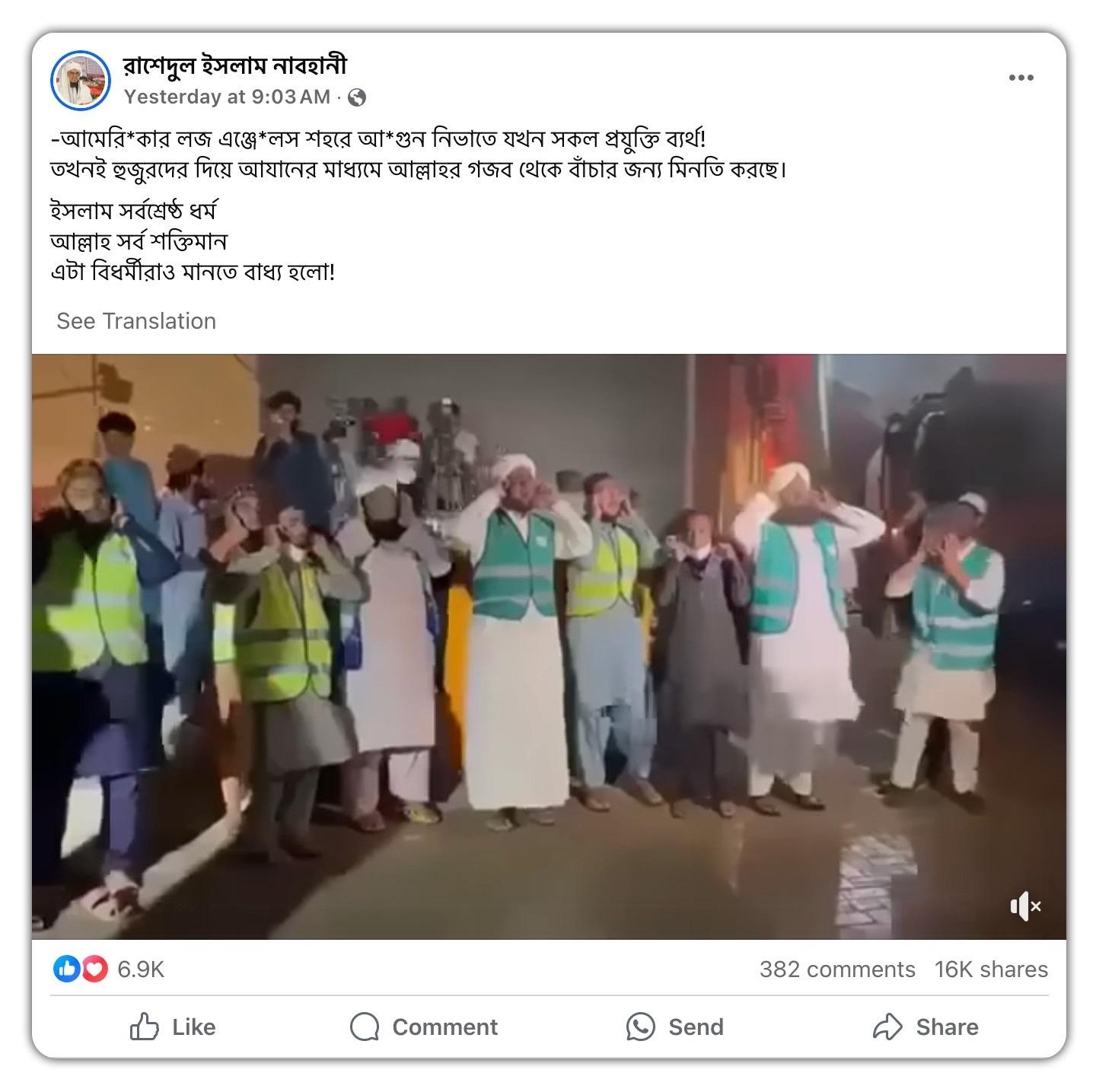 এই ধরনের ভিডিওর ক্যাপশনে লেখা হয়েছে, "আমেরি*কার লজ এঞ্জে*লস শহরে আ*গুন নিভাতে যখন সকল প্রযুক্তি ব্যর্থ! তখনই হুজুরদের দিয়ে আযানের মাধ্যমে আল্লাহর গজব থেকে বাঁচার জন্য মিনতি করছে। ইসলাম সর্বশ্রেষ্ঠ ধর্ম আল্লাহ সর্ব শক্তিমান এটা বিধর্মীরাও মানতে বাধ্য হলো!" (ক্যাপশনের বানান অপরিবর্তিত)