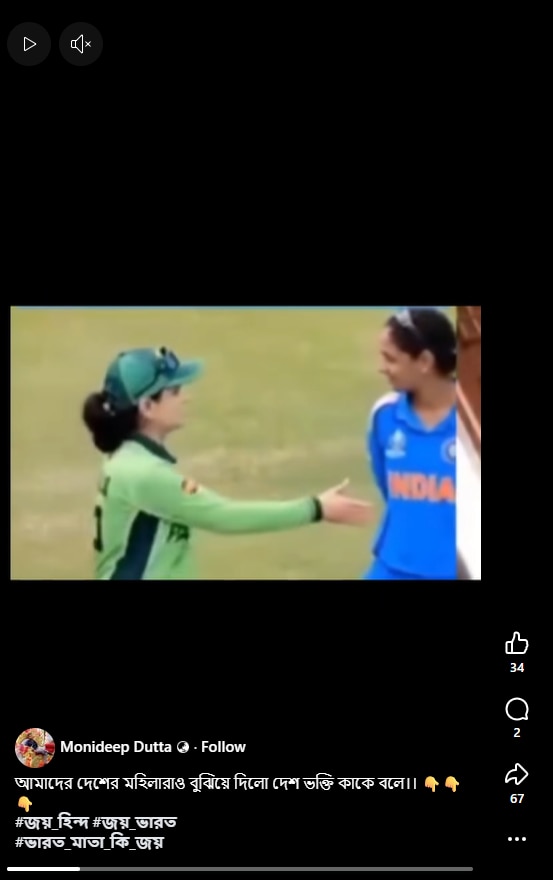 ভিডিওটি এআই দ্বারা তৈরি। টসের সময় হরমনপ্রীত বা ফাতিমা সানা কেউই করমর্দনের জন্য হাত বাড়াননি।