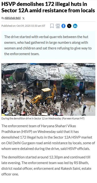 এরপর উক্ত তথ্যের উপর ভিত্তি করে এই সংক্রান্ত পরবর্তী অনুসন্ধান চালালে গত ৯ অক্টোবর এই সংক্রান্ত একটি প্রতিবেদন পাওয়া যায়। যেখানে ভাইরাল ভিডিও-র ৫ সেকেন্ডের ফ্রেমে দেখা যাওয়া ঝুপড়ির একটি ছবি-সহ উল্লেখ করা হয়েছে, “গুরুগ্রামের সেক্টর ১২ এলাকার বস্তিতে অবৈধভাবে নির্মিত ১৭২টি ঝুপড়ি ভেঙে দিয়েছে হরিয়ানা শাহারি বিকাশ কর্তৃপক্ষ (HSVP)। ২০২৫ সালের ১৬ জানুয়ারি পাঞ্জাব ও হরিয়ানা হাইকোর্ট ওই বস্তির ৮৬টি বৈধ ঝুপড়ি বাদে বাকি সব অবৈধ ঝুপড়ি উচ্ছেদের নির্দেশ দেয়। আর সেই নির্দেশ অনুযায়ী গুরুগ্রামের জেলা নোডাল অফিসার আরএস ভাট এবং অ্যাস্টেট অফিসার রাকেশ সাইনি এই উচ্ছেদ অভিযানটির নেতৃত্ব প্রদান করেন।”