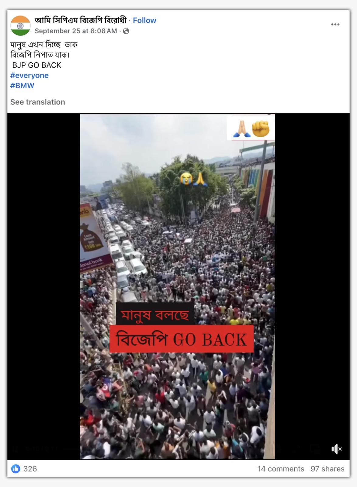 ভিডিওটি শেয়ার করে দাবি করা হচ্ছে, সেটি বিজেপি-র বিরুদ্ধে সাধারণ মানুষের বিক্ষোভের দৃশ্য। উদাহরণস্বরূপ, এক ফেসবুক ব্যবহারকারী ভাইরাল ভিডিওটি শেয়ার করে লিখেছেন, “মানুষ এখন দিচ্ছে ডাক বিজেপি নিপাত যাক। BJP GO BACK” (সব বানান অপরিবর্তিত)