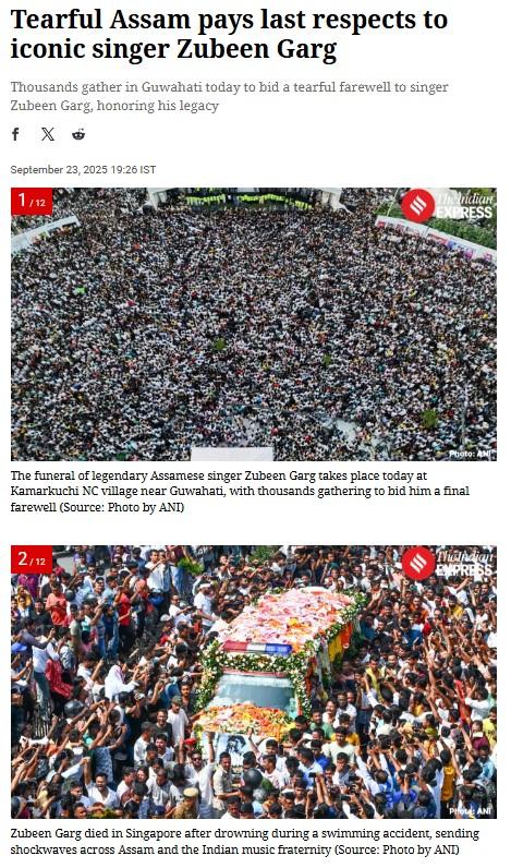 ইন্ডিয়ান এক্সপ্রেসের একটি প্রতিবেদন অনুযায়ী, ২৩ সেপ্টেম্বর গুয়াহাটিতে আয়োজিত কিংবদন্তি সঙ্গীত শিল্পী জুবিন গর্গের অন্তিম-যাত্রায় অংশগ্রহণ করেন লক্ষ-লক্ষ মানুষ। ভক্তরা এদিন গায়কের শববাহী গাড়ির পিছনে দীর্ঘ পথ হেঁটে তাঁর প্রতি শ্রদ্ধা নিবেদন করেন। অসমের মুখ্যমন্ত্রী হিমন্ত বিশ্ব শর্মা-সহ অন্যান্য বিশিষ্ট ব্যক্তিদের উপস্থিতিতে গুয়াহাটি সংলগ্ন কামারকুচি এনসি গ্রামে অনুষ্ঠিত হয় জুবিনের শেষকৃত্য। অন্যদিকে, জুবিন গর্গের অন্তিম-যাত্রাকে বিশ্বের চতুর্থ বৃহত্তম জনসমাগম হিসেবে তালিকাভুক্ত করা হয়েছে লিমকা বুক অফ রেকর্ডসে। যা পপ তারকা মাইকেল জ্যাকসন, পোপ ফ্রান্সিস এবং ব্রিটেনের রানী দ্বিতীয় এলিজাবেথের মতো ব্যক্তিত্বদের বিদায়ের পাশাপাশি স্থান করে নিয়েছে।