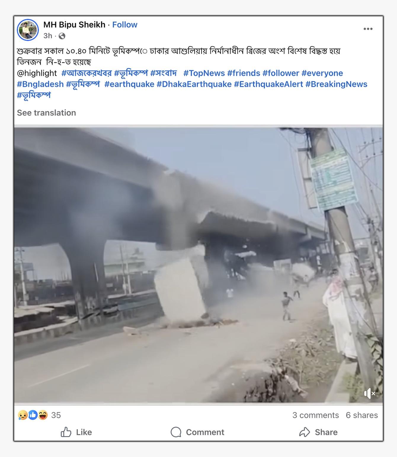 একাধিক ফেসবুক ব্যবহারকারী এই ভিডিওটি বাংলাদেশের আশুলিয়ার ঘটনা বলে প্রচার করছেন। ভিডিওটি পোস্ট করে ক্যাপশনে লেখা হয়েছে, “আজকের (ভুমি কম্প) আশুলিয়ায়, হয়তো এটাই আমাদের,অনেকের জীবনের শেষ শুক্রবার।”