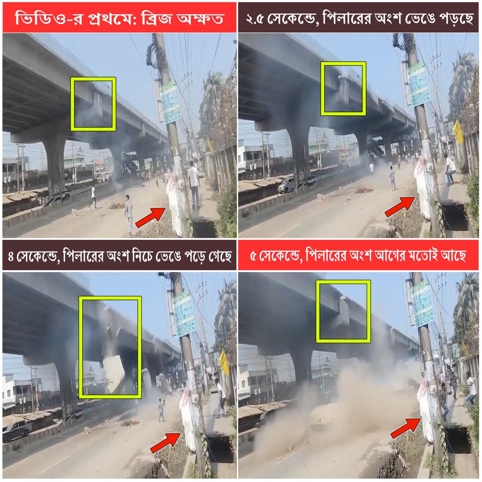 ৪ সেকেন্ড পরবর্তী সময় গার্ড পিলারের অংশটি ভেঙে নিচে পড়ে যাচ্ছে। এবং ভিডিওর শেষ অংশে, ৫ সেকেন্ড নাগাদ পিলারের অংশটি নিচে পড়ে ভেঙে যাচ্ছে। কিন্তু ঠিক সেই সময় উড়ালপুলের গার্ড পিলারকে আগের মতই অক্ষত অবস্থায় দেখা যাচ্ছে। যেন কিছুই হয়নি। যা দেখে পরিষ্কার হয়ে যায় যে ভিডিওটি আসল কোনও ঘটনার নয়। সেই সঙ্গে তুলনা করা চারটি ফ্রেমেই সাদা পোশাক পরিহিত ওই ব্যক্তিকে একইভাবে দাঁড়িয়ে থাকতে দেখা যাচ্ছে। কিন্তু বাকিরা ছোটাছুটি করছেন। যা কোনও স্বাভাবিক এবং আসল ঘটনায় সম্ভব না।