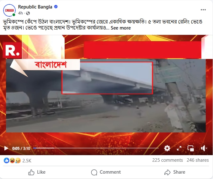 আজতক ফ্য়াক্ট চেক অনুসন্ধান করে দেখেছে যে ভাইরাল ভিডিওটি এআই বা কৃত্রিম বুদ্ধিমত্তার দ্বারা তৈরি। ভূমিকম্পের জেরে বাংলাদেশের নানা ক্ষয়ক্ষতি হলেও উড়ালপুলের একাংশ বিপজ্জনকভাবে ভেঙে পড়ার কোনও খবর নেই।
