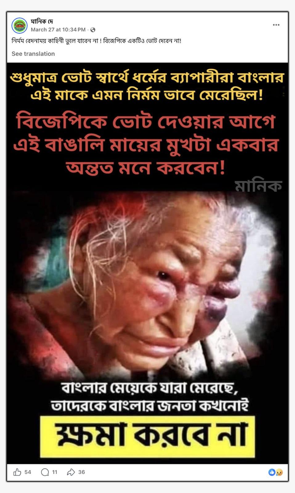 উদাহরণস্বরূপ, ভাইরাল ছবিটি শেয়ার করে এক ফেসবুক ব্যবহারকারী লিখেছেন, “শুধুমাত্র ভোট স্বার্থে ধর্মের ব্যাপারীরা বাংলার এই মাকে এমন নির্মম ভাবে মেরেছিল! বিজেপিকে ভোট দেওয়ার আগে এই বাঙালি মায়ের মুখটা একবার অন্তত মনে করবেন! বাংলার মেয়েকে যারা মেরেছে, তাদেরকে বাংলার জনতা কখনোই ক্ষমা করবে না। নির্মম বেদনাময় কাহিনী ভুলে যাবেন না! বিজেপিকে একটিও ভোট দেবেন না!”