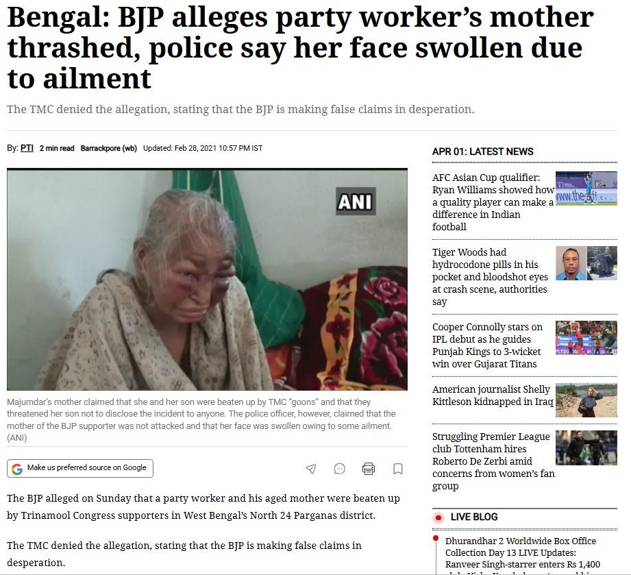 ভাইরাল ছবির বৃদ্ধা শোভা মজুমদারকে বিজেপি কর্মীদের দ্বারা নয়, বরং ২০২১ সালের ২৭ ফেব্রুয়ারি তাঁকে এবং তাঁর ছেলেকে তৃণমূল কর্মীরা মারধর করেছিল বলে অভিযোগ ছিল।
