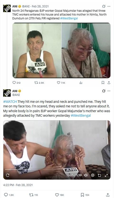 এরপর এই সংক্রান্ত আরও অনুসন্ধান চালালে ২০২১ সালের ২৮ ফেব্রুয়ারি সংবাদ সংস্থা ANI-র অফিশিয়াল এক্স হ্যান্ডেলে আক্রান্ত বৃদ্ধা শোভা মজুমদারের একটি বিবৃতি পাওয়া যায়। সেখানে ছেলে গোপাল মজুমদার পাশে নিয়ে তিনি জানান, “ওকে (ছেলে) মাথায় বাড়ি দিয়েছে। তৃণমূলরা মেরেছে। আমাকে ঘাড় ধাক্কা দিয়েছে। মুখে মেরেছে। ভোর সাড়ে চারটের সময় এসেছিল। আমি ভয় পেয়েছি। ওকে (ছেলে) বলেছে স্বীকার করবে না কে মেরেছে।”