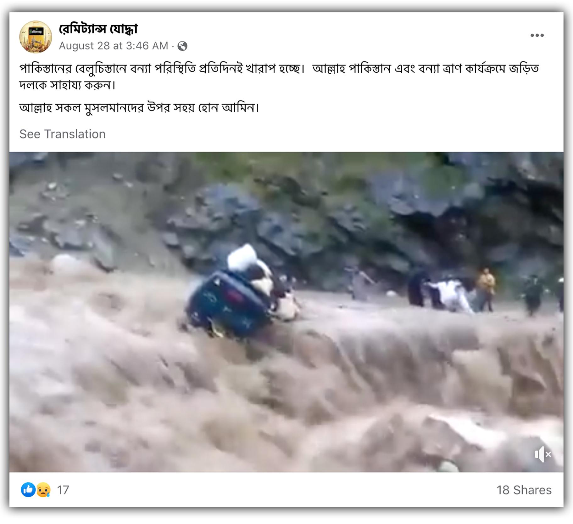 ফেসবুকে ভাইরাল ভিডিওটি পোস্ট করে দাবি করা হয়েছে যে ভিডিওটি পাকিস্তানের সাম্প্রতিক বন্যা পরিস্থিতির। ক্যাপশনে লেখা হয়েছে, "পাকিস্তানের বেলুচিস্তানে বন্যা পরিস্থিতি প্রতিদিনই খারাপ হচ্ছে। আল্লাহ পাকিস্তান এবং বন্যা ত্রাণ কার্যক্রমে জড়িত দলকে সাহায্য করুন। আল্লাহ সকল মুসলমানদের উপর সহয় হোন আমিন।" (পোস্টের ক্য়াপশনের বানান অপরিবর্তিত)