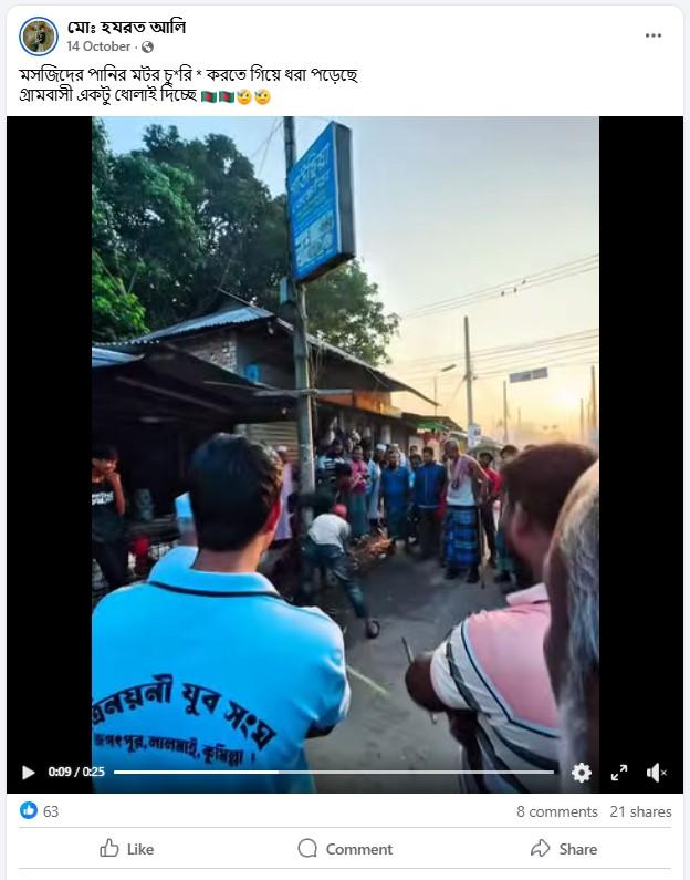তাই এরপর ভাইরাল ভিডিও সম্পর্কে জানতে সেটি থেকে একাধিক কিফ্রেম সংগ্রহ করে সেগুলি গুগলে রিভার্স ইমেজ সার্চ করলে চলতি বছরের ১৪ অক্টোবর একটি ফেসবুক প্রোফাইলে এই একই ভিডিও পাওয়া যায়। ভিডিওটি শেয়ার করে ক্যাপশনে লেখা হয়েছে, “মসজিদের পানির মটর চু*রি * করতে গিয়ে ধরা পড়েছে, গ্রামবাসী একটু ধোলাই দিচ্ছে।” এই একই দাবি-সহ আরও একাধিক বাংলাদেশ ভিত্তিক ফেসবুক প্রোফাইল থেকেও এই একই ভিডিও শেয়ার করা হয়েছে।