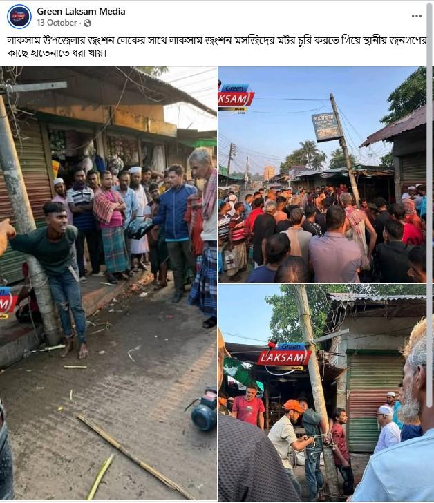 এরপর উক্ত তথ্যের উপরে ভিত্তি করে এ বিষয়ে একাধিক কিওয়ার্ড সার্চ করলে চলতি বছরের ১৩ অক্টোবর ‘Green Laksam Media’ নামক একটি বাংলাদেশ ভিত্তিক নিউজ পোর্টালে ভাইরাল ভিডিও-র একাধিক স্ক্রিনশট-সহ একটি পোস্ট পাওয়া যায়। সেই পোস্টের ক্যাপশনে উল্লেখ করা হয়েছে, “লাকসাম উপজেলার জংশন লেকের সাথে লাকসাম জংশন মসজিদের মটর চুরি করতে গিয়ে স্থানীয় জনগণের কাছে হাতেনাতে ধরা খায়।”