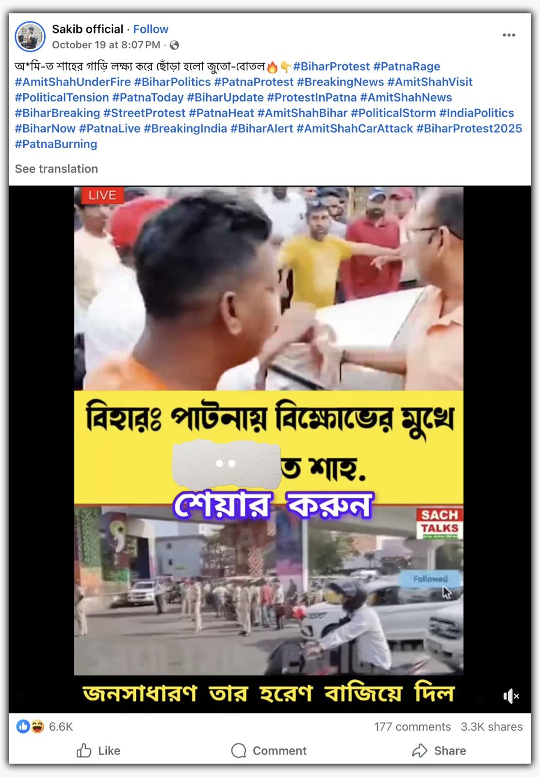ভিডিওটি শেয়ার করে দাবি করা হচ্ছে, পটনায় কেন্দ্রীয় স্বরাষ্ট্রমন্ত্রী অমিত শাহের গাড়ি লক্ষ্য করে বিক্ষোভ প্রদর্শনের পাশাপাশি জুতো ও বোতল দিয়ে হামলা চালিয়েছে বিহারের সাধারণ মানুষ। উদাহরণস্বরূপ, এক ফেসবুক ব্যবহারকারী ভাইরাল ভিডিওটি শেয়ার করে লিখেছেন, “অ*মি-ত শাহের গাড়ি লক্ষ্য করে ছোঁড়া হলো জুতো-বোতল।” অন্যদিকে ভিডিও-র ফ্রেমের উপরে লেখা হয়েছে, “বিহারঃ পাটনায় বিক্ষোভের মুখে অমিত শাহ। জনসাধারণ তার হরেণ বাজিয়ে দিল।”