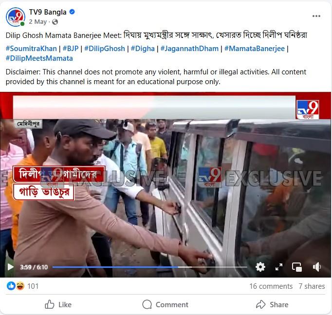 তাই এরপর ভাইরাল দাবির সত্যতা জানতে আমরা গাড়িতে হামলা ও ভাঙচুর চালানোর ক্লিপটি থেকে একাধিক কিফ্রেম নিয়ে সেগুলি গুগলে রিভার্স ইমেজ সার্চ করি। তখন ২০২৫ সালের ২ মে টিভি৯ বাংলার অফিশিয়াল ফেসবুক পেজে ও ইউটিউব চ্যানেলে এই একই ক্লিপ-সহ একটি প্রতিবেদন পাওয়া যায়। সেই প্রতিবেদন থেকে জানা যায়, চলতি বছরের ১ মে মেদিনীপুরের সিপাই বাজারে প্রাক্তন বিজেপি রাজ্য সভাপতি দিলীপ ঘোষ ঘনিষ্ঠ বিজেপি নেতা তথা দলের পশ্চিম মেদিনীপুর জেলা বিজেপি সভাপতি শমিত মণ্ডলের গাড়িতে হামলা চালায় দলের বিক্ষুদ্ধ কর্মীরা।