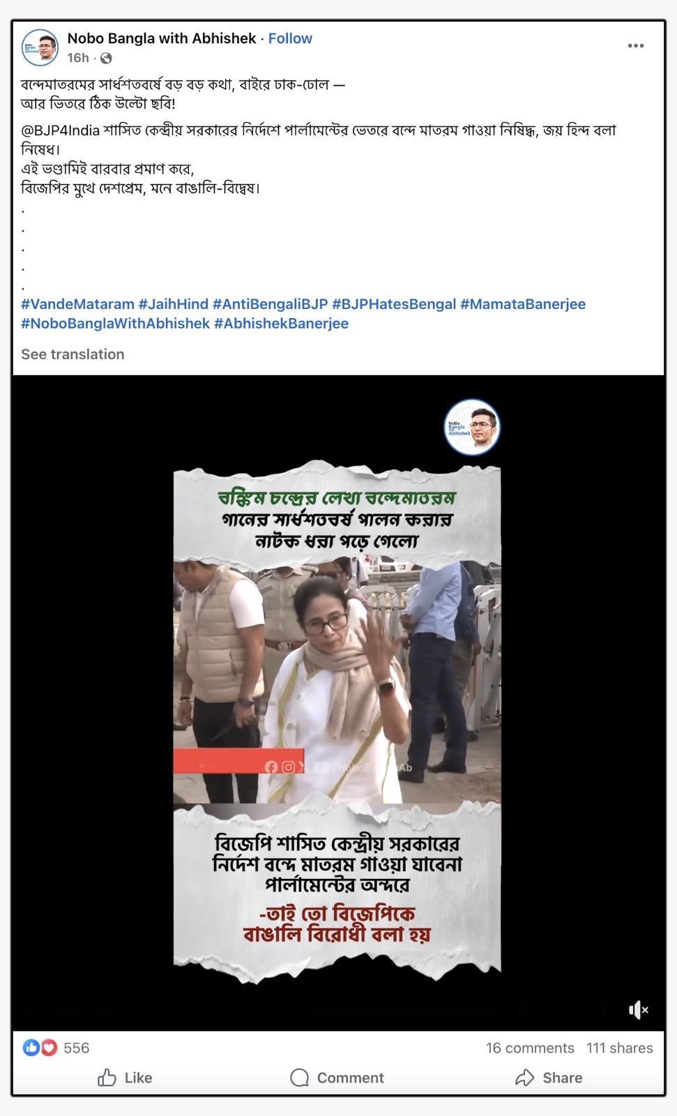 তৃণমূল সমর্থকদের একটা বড় অংশ মমতা বন্দ্যোপাধ্যায়ের প্রতিক্রিয়ার ভিডিওটি পোস্ট করে সঙ্গে লেখেন, “বিজেপি শাসিত কেন্দ্রীয় সরকারের নির্দেশে পার্লামেন্টের ভেতরে বন্দে মাতরম গাওয়া নিষিদ্ধ, জয় হিন্দ বলা নিষেধ।”
