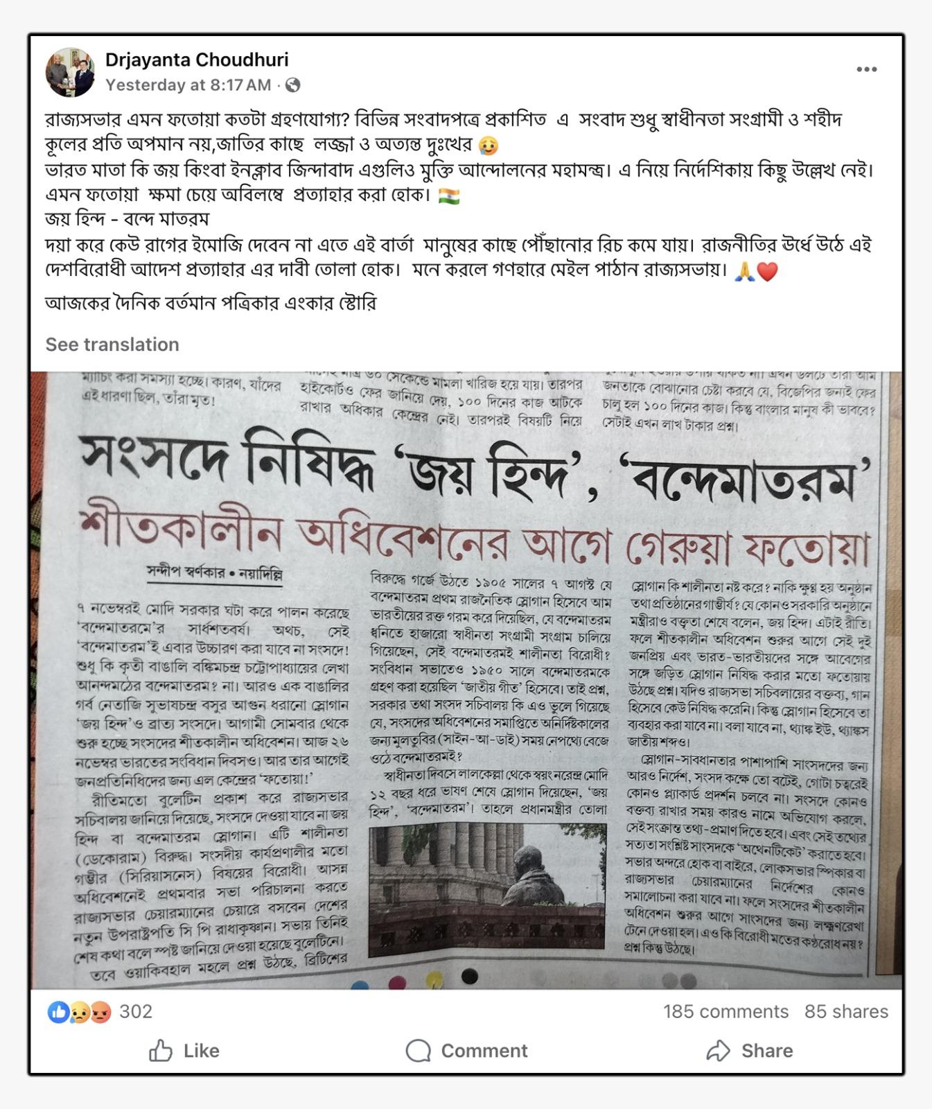 সংসদে ‘বন্দেমাতরম’ এবং ‘জয় হিন্দ’ নিষিদ্ধ হয়েছে দাবি করে জি ২৪ ঘণ্টায় একটি ভিডিও প্রতিবেদন প্রকাশ করা হয় এবং ওয়েবসাইটেও একটি খবর প্রকাশ পায়।