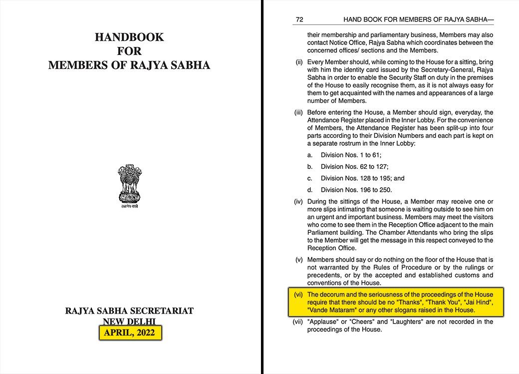 এই বিজ্ঞপ্তির ৭২ নম্বর পাতার ৬ নম্বর পয়েন্টে লেখা হয়, “The decorum and the seriousness of the proceedings of the House require that there should be no "Thanks", "Thank You", "Jai Hind", "Vande Mataram" or any other slogans raised in the House.” এই বাক্যটিকে বাংলায় অনুবাদ করলে দাঁড়ায়, “অধিবেশনের (লোকসভা/রাজ্যসভা) আচরণবিধি এবং কার্যবিবরণীর গুরুত্বের কারণে সভা চলাকালীন ধন্যবাদ, আপনাকে ধন্যবাদ, জয় হিন্দ, বন্দেমাতরম অথবা অন্য কোনও স্লোগান তোলা উচিত নয়।”